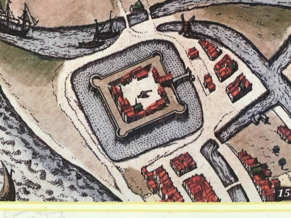 Stavoren im 17. Jahrhundert, damals bildete sich eine Sandbank vor der Hansestadt, die damals noch an der offenen Nordsee, von den Niederländern Zuidersee genannt, lag.