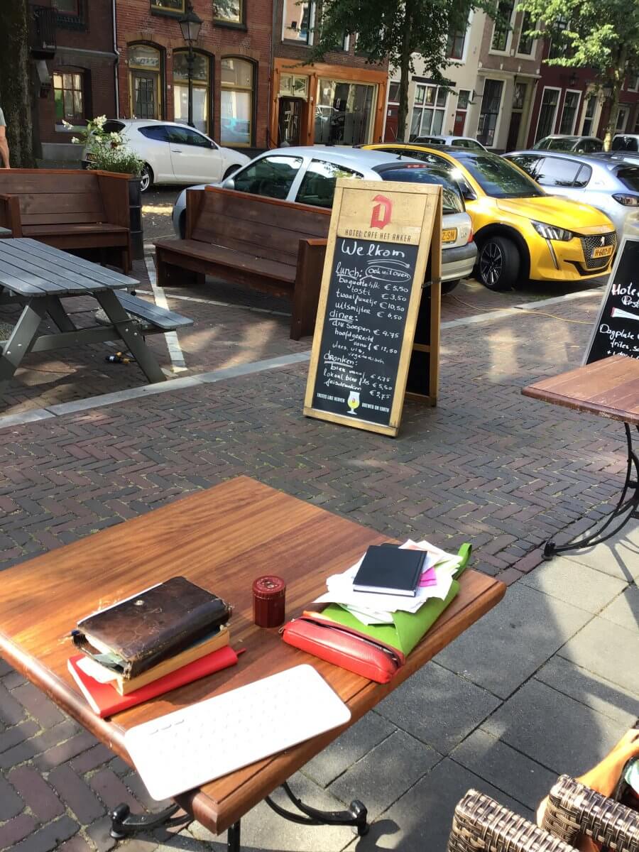 aber erstmal lasse ich diesen Werktag, der ein enormer Feiertag wird, ahnungslos angehen. Vorm ´t Anker sitzt eine unter Linden, Chris, der Hotelchef, pustet deren Blüten weg und ich nehme im dortigen JETZT am Leben teil, der Eewal ist mir ans Herz gewachsen, eine geschäftige Straße ohne großes Getöse, wo die Leute einander kennen, grüßen und aandacht (Aufmerksamkeit) schenken. Und trotz Geschäftigkeit immer Zeit für einen Schnack haben.