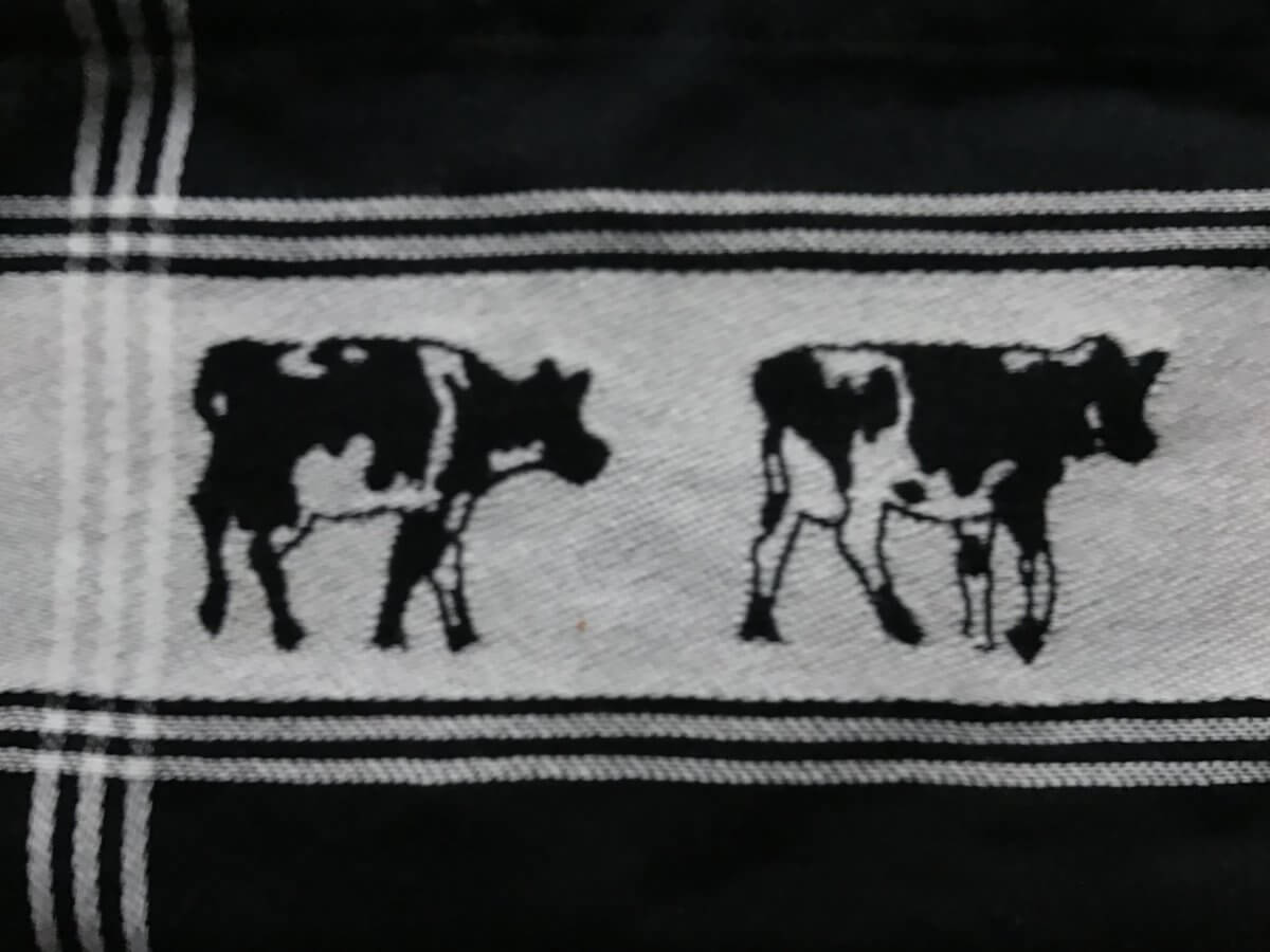 Die berühmte friesische Kuh ist in mein neues Geschirrtuch gewebt; hat eine Statue in Leeuwarden, unter der „Us mem“ steht, unsere Mutter; ist anthropozentrisch betrachtet ein milchbetontes Zweinutzungsrind; gehört zu den bedrohten Nutztierrassen und wird offiziell schwarzbuntes Niederungsrind genannt.