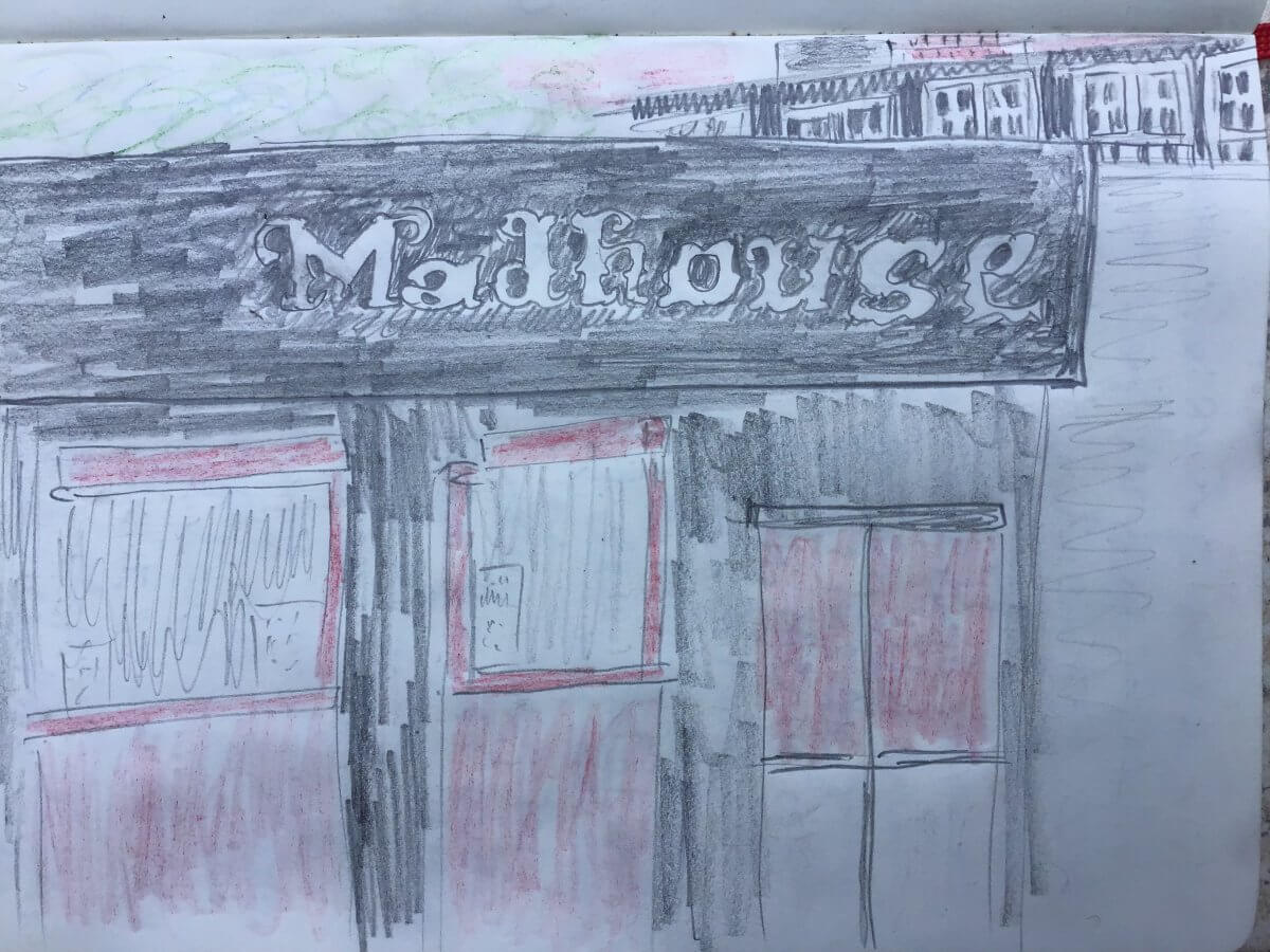 So stand ich vorm Madhouse, einem räudigen „Rockschuppen“, wie Jan Freitag 2016, das war 16 Jahre nach der allseitig bedauerten Schließung von Hamburgs „dienstältester Disco“, schreibt. Vorher hatte dieser Bungalow mit langem schwarzem Eingangstunnel – auf meiner Zeichnung verbirgt der finstere Gang sich hinter dem rot-weißen Tor rechts – das ganze Jahr abendlich geöffnet und beförderte unter anderem, wie Freitag schrieb, Hamburgs analogen „Ruf in Sachen Abendgestaltung“.