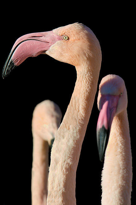 Die unten abgebildeten Vögel gehören zu den Phoenicopteridae. Ihr Gefieder ist durch die Carotinoide, die sie aus winzigen Wasserorganismen „verstoffwechseln“ rosa gefärbt. Sie leben vorzugsweise an salzhaltigen Seen, aus denen sie mit ihrem gebogenen Seihschnabel Insekten, Würmer, Schnecken, Laich und Pflanzenteile sieben. Aber sie kommen auch an den Meeresbuchten der Westsahara vor!