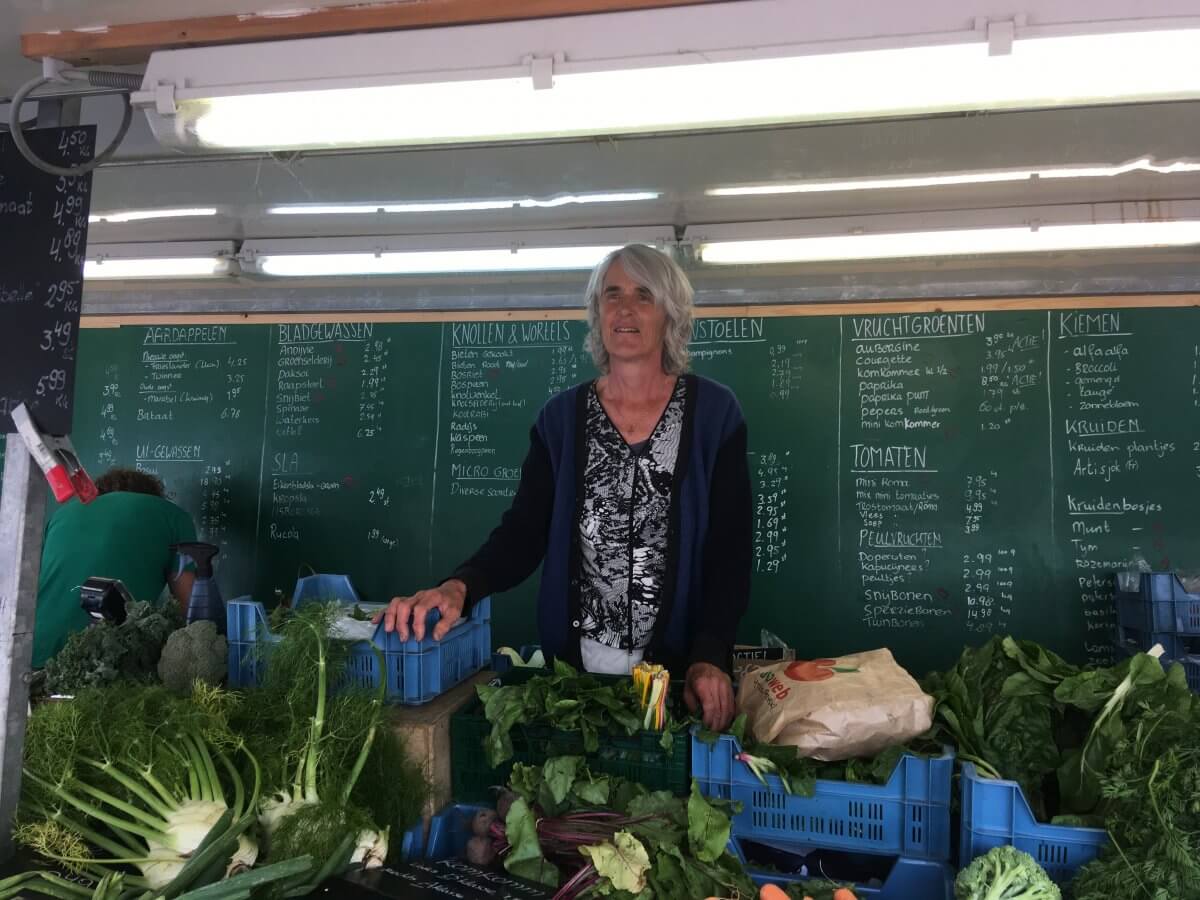 Die nächste dieser wunderbaren, kurzfristigen Begleiter*innen treffe ich am Gemüsestand. Dort thront stehend Aukje, hochgewachsen, weißhaarig, mit durchblickenden Augen, die sich nichts mehr vormachen lassen. Sie war mit ihrem Bio-Gemüsestand 1997 Pionierin hier im Land der „Wassertomaten“, wie wir über die inhaltsleeren holländischen Treibhausfrüchte zu lästern pflegten, die zum Beispiel in Hamburg statt der superleckeren regionalen Ware aus den Marschlanden an der Elbe den Markt fluteten. Inzwischen hat sie ihn weitergegeben und arbeitet dort nur noch einige Stunden in der Woche, sagt ich soll zum Schichtende vorbeikommen.