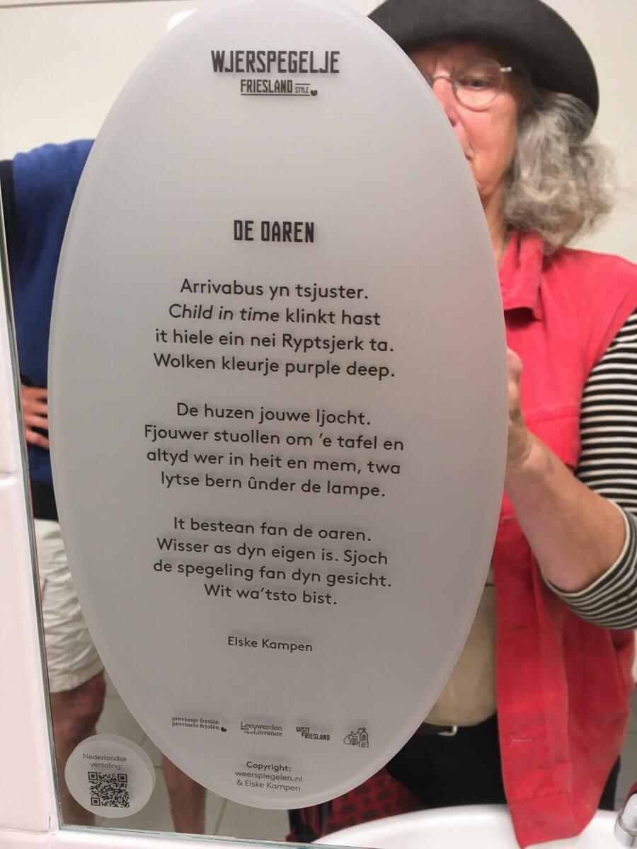 Dann führt mich Aukje zum tresoar, archief, museum en bibliothek Fryslân (tresoar.nl). Auf der Toilette dort entdecke ich ein Gedicht am Spiegel, von der friesischen Dichterin Elske Kampen, einer Beinahe-Altersgenossin, Jahrgang 1955. Sie wohnt in Gytsjerk, das ist der Ort, in dem ich ein wenig später ein paar Tage wohnen würde, aber das wusste ich an jenem Freitag noch nicht. Es handelt von einer Busfahrt nach Ryptsjerk, das ist der Ort, wo Aukje wohnt. Eine Single ist im Dunklen unterwegs, sieht im Vorbeifahren in jedem Haus ein Eltern- und ein Kinderpaar – und dann sich, wie sich ihr Gesicht in der Fensterscheibe spiegelt. Sie sitzt im Arrivabus. Das britische Verkehrsunternehmen befördert Niederländer*innen und Passagiere in neun weiteren europäischen Ländern und ist in Friesland quasi das Synonym fürs Busfahren. tsjuster heißt düster. Sie hört Child in time. Und sieht die Wolken sich „purple deep“ färben. Erblickt in den Häusern je vier Stühle um eine Tafel, klassische Kleinfamilien unter der Lampe. „Suche die Spiegelung deines Gesichtes. Werde dir bewusst, was du bist.“ Das spiegelt mich Alleinreisende wieder.