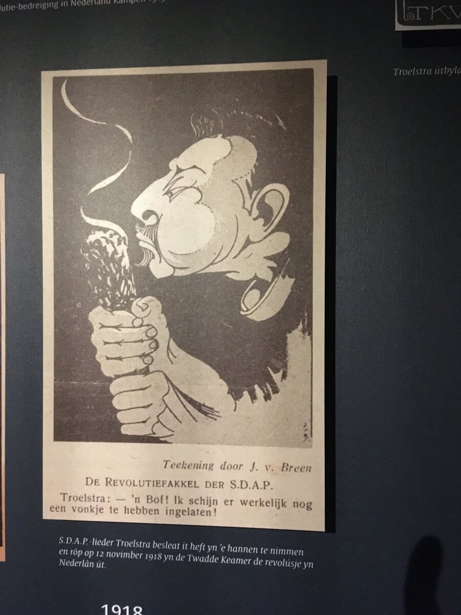 Wir gehen in die Ausstellung über Piter Jelles Troelstra, 1860 in Leeuwarden geboren. „Ich ging aus der Masse der namenlosen Arbeiter hervor, die täglich für ihr Brot arbeiten“, sagte er über sich, und arbeitete als Politiker, Dichter, Anwalt. Vor allem sei er ein Seher gewesen, sagt Aukje. Und „Anschluss gefunden“ bei den Fries*innen habe er durch seine Dichtkunst: „Noch lebt die alte friesische Sprache auf 1000 friesischen Zungen; in ihr hat mancher Friese von allem was gut und wahr ist gesungen“, hat er geschrieben, und Aukje erzählt mir von einem Austausch in ihrer Jugend mit gleichaltrigen Fries*innen von Amrum und Föhr. Das wären keine Nazis gewesen, sagt sie, weil ich ihr vorher davon berichtet habe, wie viele alte Nazis im Nachkriegsdeutschland in neuem Gewand einfach weitermachten wie vorher.