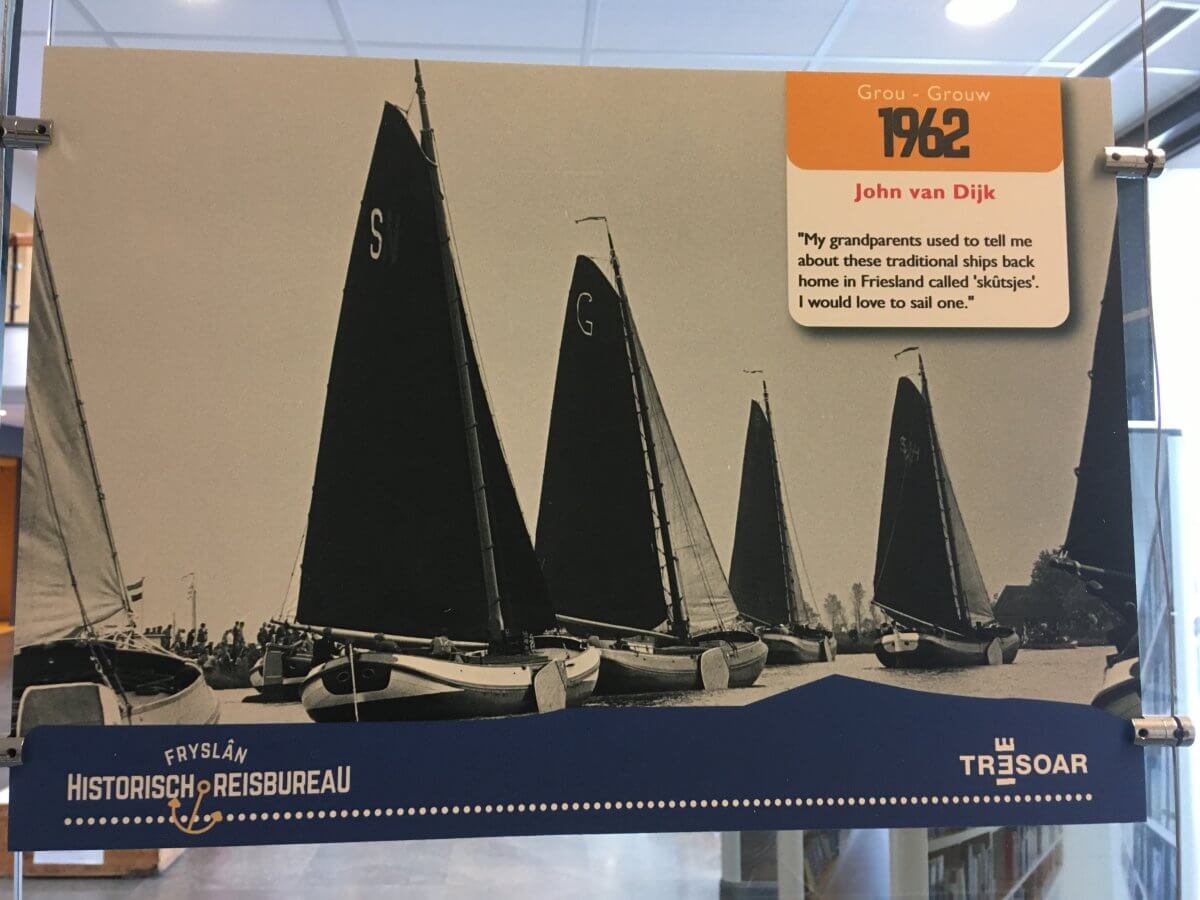 Ein Bild aus Grou/Grouw, dem Ort zu dem ich am kommenden Tag in Sachen Segelregatta fahren würde, aus dem Jahr 1962; John van Dijk schreibt dazu, sein Großvater habe ihm von diesen traditionellen Schiffen zu Hause in Friesland erzählt, den skûtsjes, und er würde sehr gerne mal so ein Boot segeln.