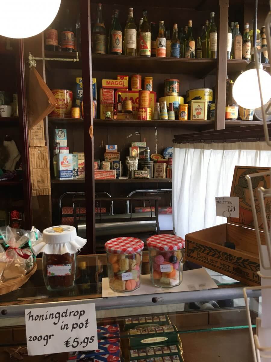 In diesem Gebäude aus dem 17. Jahrhundert befand sich vorher „de vivo-winkel van de dames Feenstra“, so steht es auf dem Info-Blatt. ViVo steht für die 1942 gegründete Vrijwillige Inkoop- en Verkoop Organisatie, ein freiwilliger Zusammenschluss der winkel, so das niederländische Wort für Laden, zu einer Ein- und Verkaufskette; die Damen Feenstra standen hinter der Theke. Die Ausstellung zeigt die Entwicklung vom kleinen Lebensmittelladen (kruidinier oder grutter) zum Supermarkt – und was dabei so alles auf der Strecke blieb.