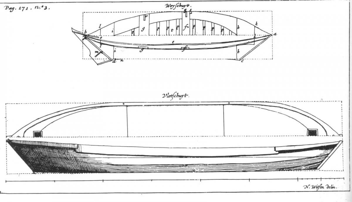 Nicolaes Witsen, unter anderem Bürgermeister von Amsterdam, erstellte 1690 ein Buch über den Schiffbau mit zahlreichen Kupferstichen, einer davon zeigt einen Prahm. Und Ian und ich besteigen an diesem Tag einen elektrischen Prahm für den beschaulichen Transport von Touristinnen.