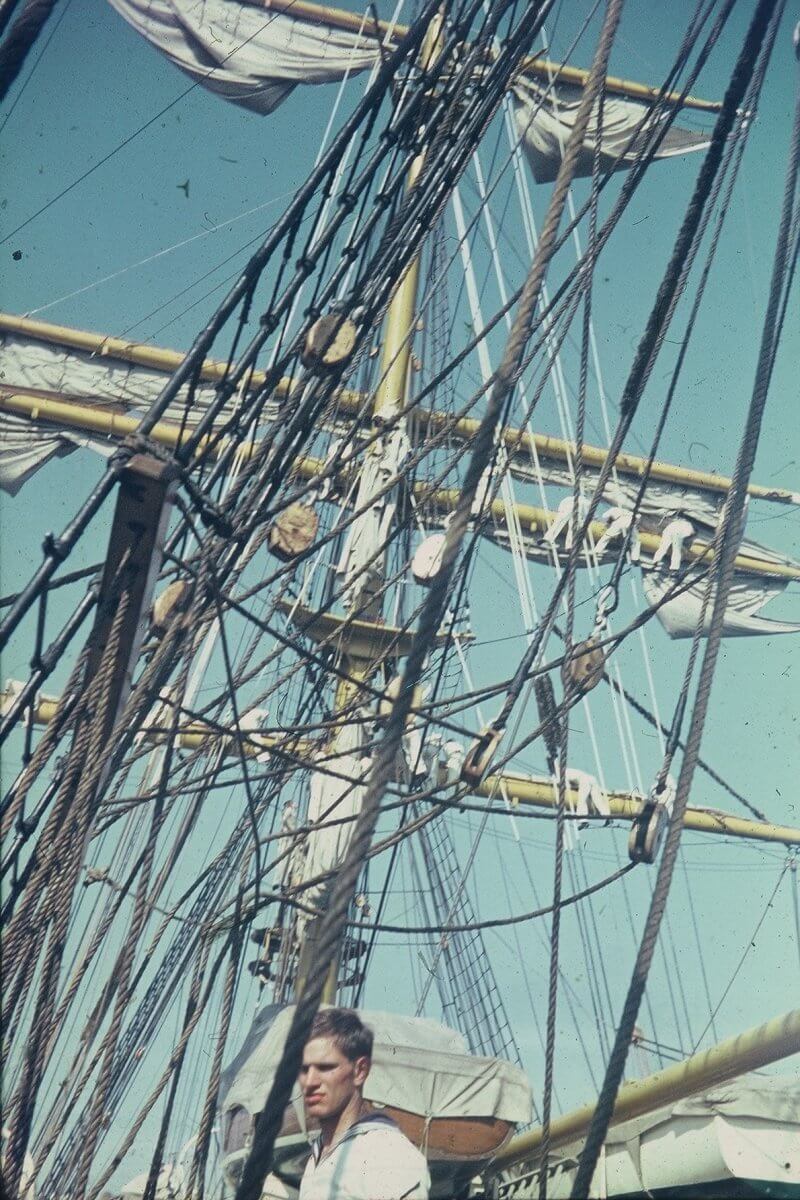 Dieses 1958 in den Dienst gestellte Segelschulschiff – zu sehen sind auf diesem Foto von 1968 sein Rigg, die Takelage aus Masten und Tauwerk, das sie hält, und ein Soldat der Deutschen Marine – besiegte Ian mit seiner Crew, wie er mir stolz berichtete.