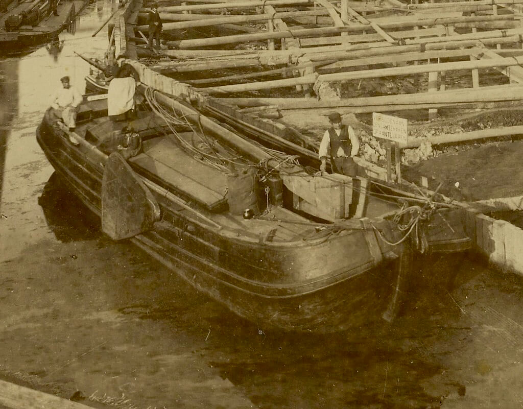 Das niederländische Schifffahrtsforum (www.kustvaartforum.com) schreibt unter dieses Bild: „Die Tjalk in Binnen- und Küstenfahrt“. Auf einem anderen historischen Foto entdecke ich eine unter der Last fast versinkende Tjalk 1932 vor der Holzfabrik in Grou (siehe: Der karierte Koffer fährt nach Fryslân, Teil 11).