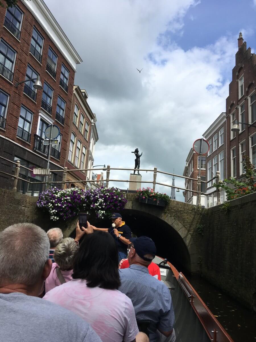 Von da unten lässt sich auch sehr gut erkennen, das wir dort cruisen, wo früher die Flut der Middelzee auflief, hart an der Flanke der terp (Warft), denn links von uns, auf der Seite der Binnenstad und des Eewal, erhebt sich das Ufer höher als auf der rechten Seite. Nun verweist uns der Guide auf eine weitere Statue, eine kleine, oben auf der Brücke, die „Tänzerin Margaretha“, es ist ein Denkmal für die Leeuwardnerin Mata Hari.