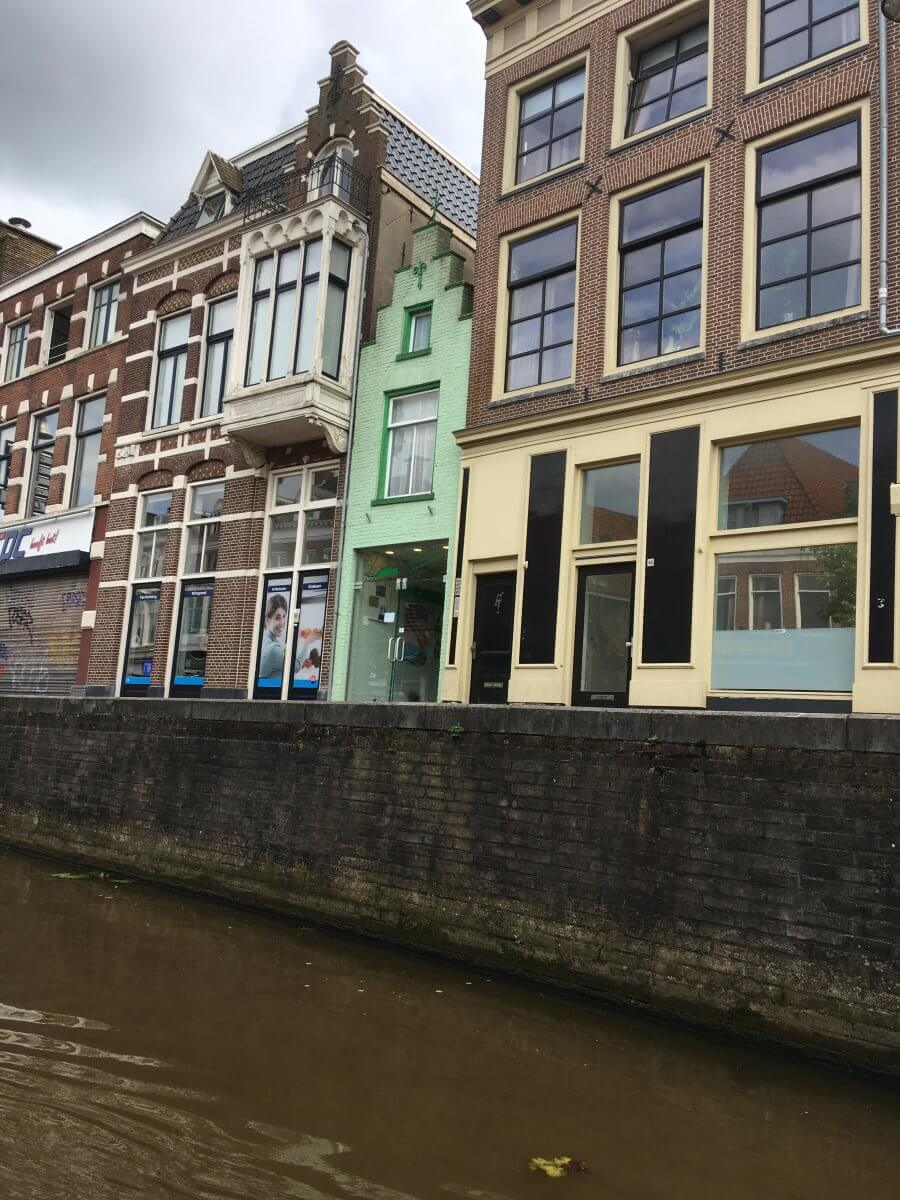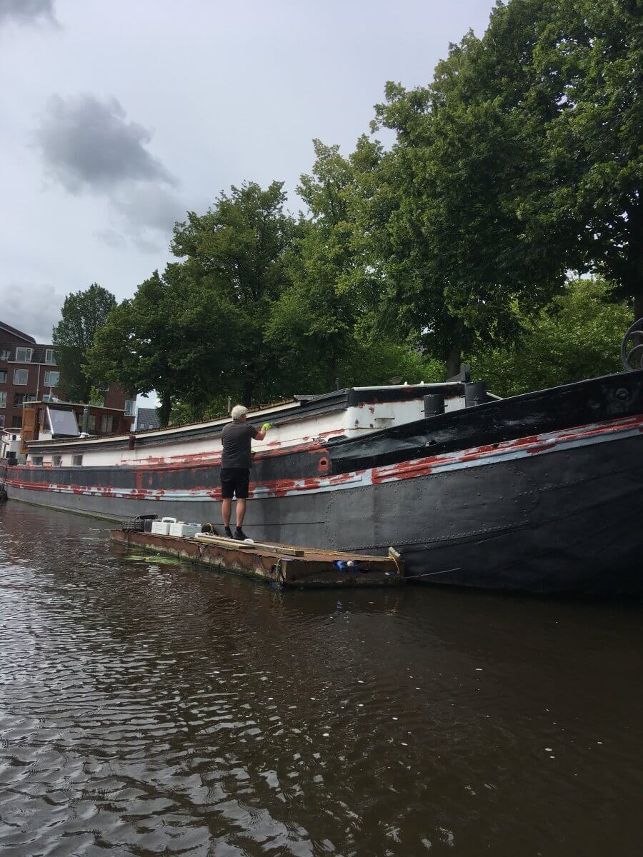 Wir sehen den kleinsten Laden der Stadt und seine alte Centraal Apotek, den uralten Eisladen La Venezia, den „first skyscraper“, passieren ein pakhuis (Lagerhaus). Und dann erblickt Ian eine Tjalk. Wir wollen ja beide rechthaben, deswegen verweise ich auf die unendlich viele Arbeit, die so eine Wohnung auf dem Wasser mit sich bringt, aber er ist Optimist.