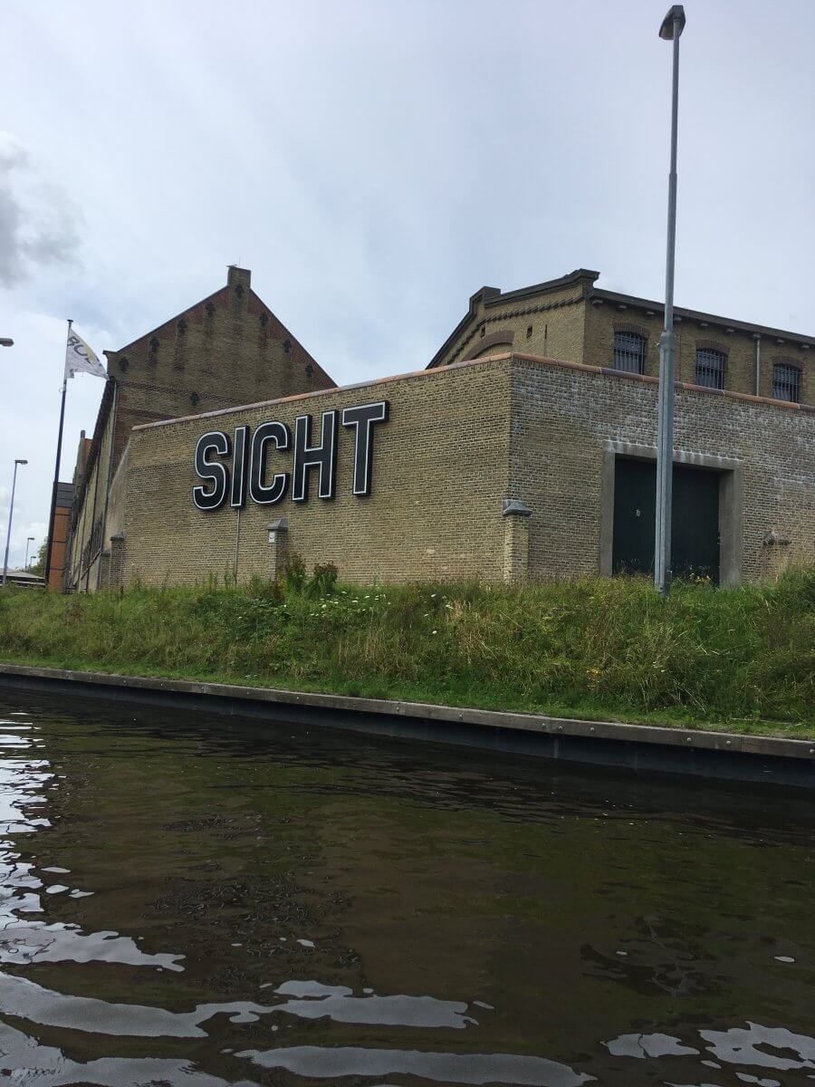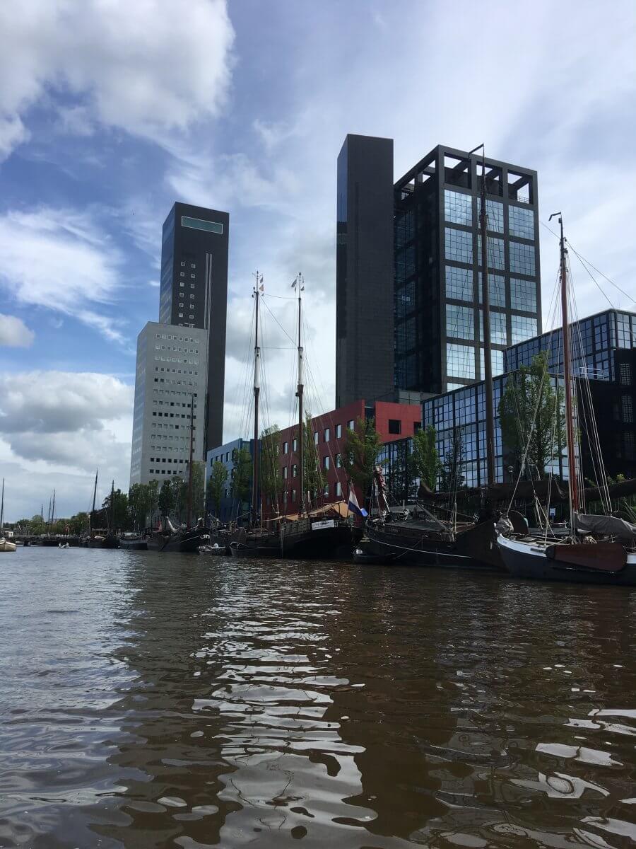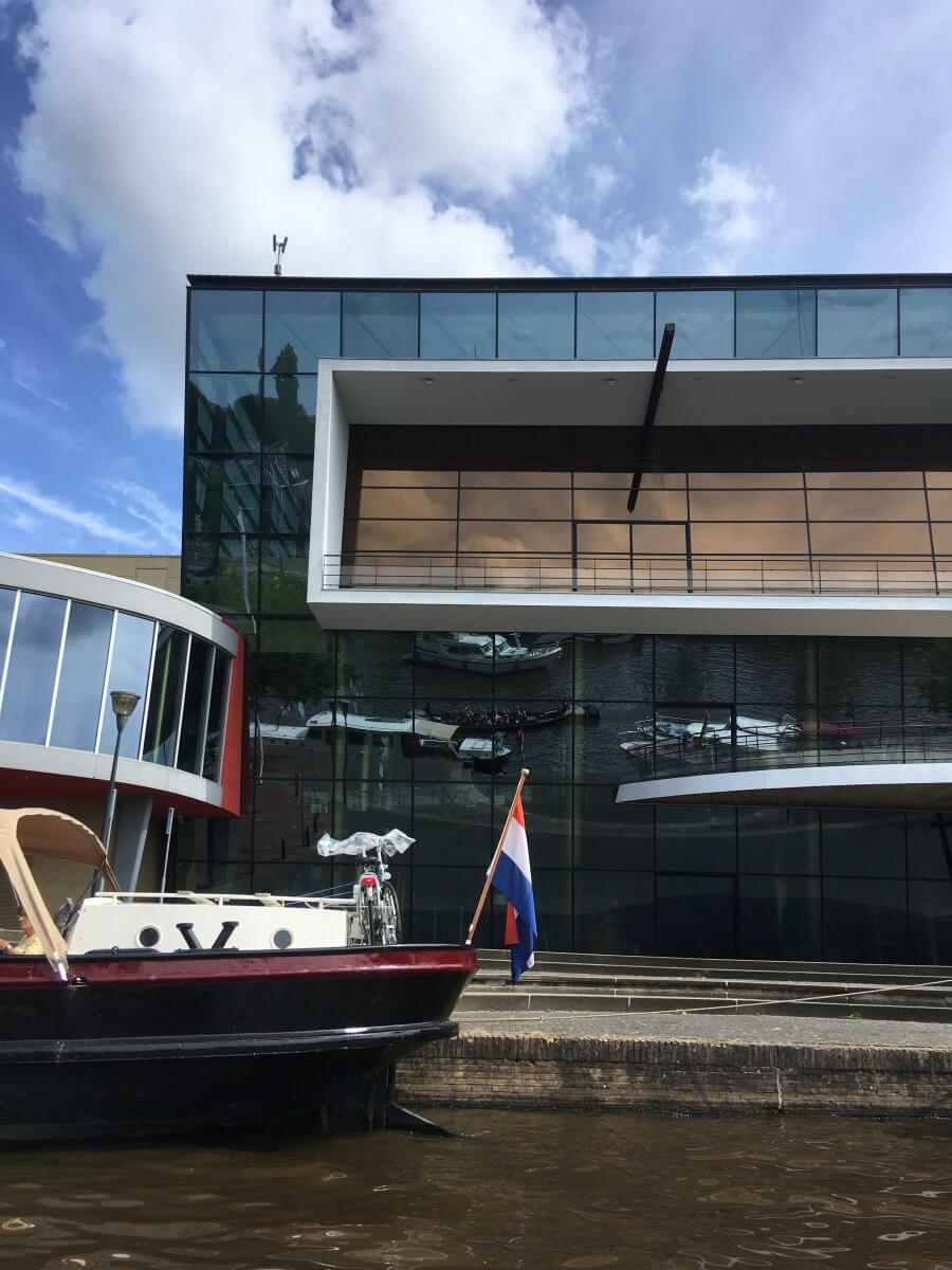 Wir erfahren, dass De Harmonie eines der größten und besten Theater der Niederlande ist. Und ich versuche mit meinem winzigen Photophone einen „Praam-Selfie“ zu schießen beim Vorüberfahren. Bei sehr genauem Hinsehen sind wir in unserem schwarzen Gefährt zwischen den weißen Yachten als Spiegelung zu erkennen.