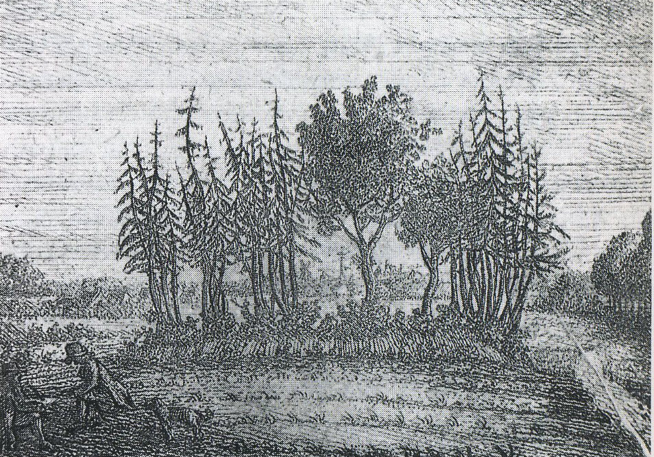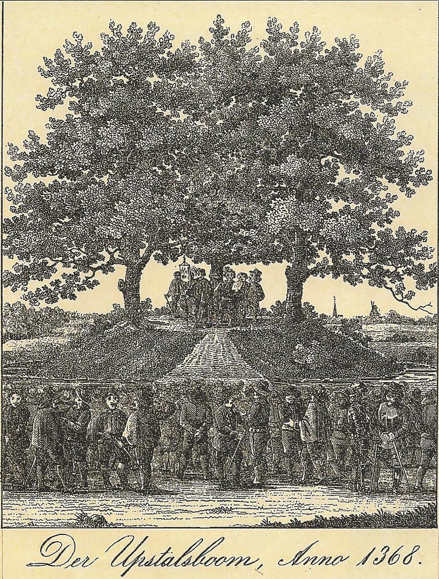 Der Upstalsboom, oben: älteste bekannte Ansicht von Conrad Bernhard Meyer, 1790; unten: „anno 1368“, historisierende Radierung aus dem 19. Jahrhundert