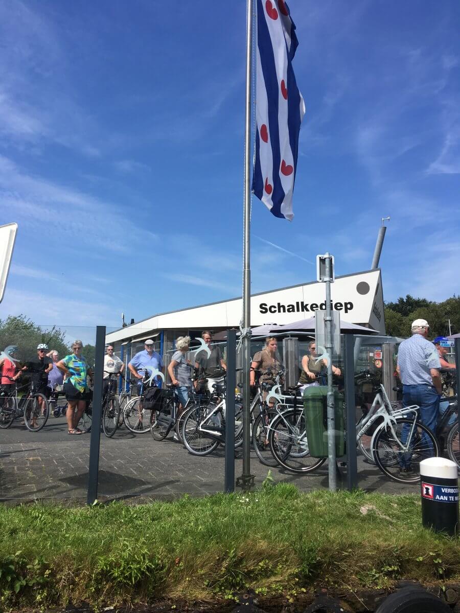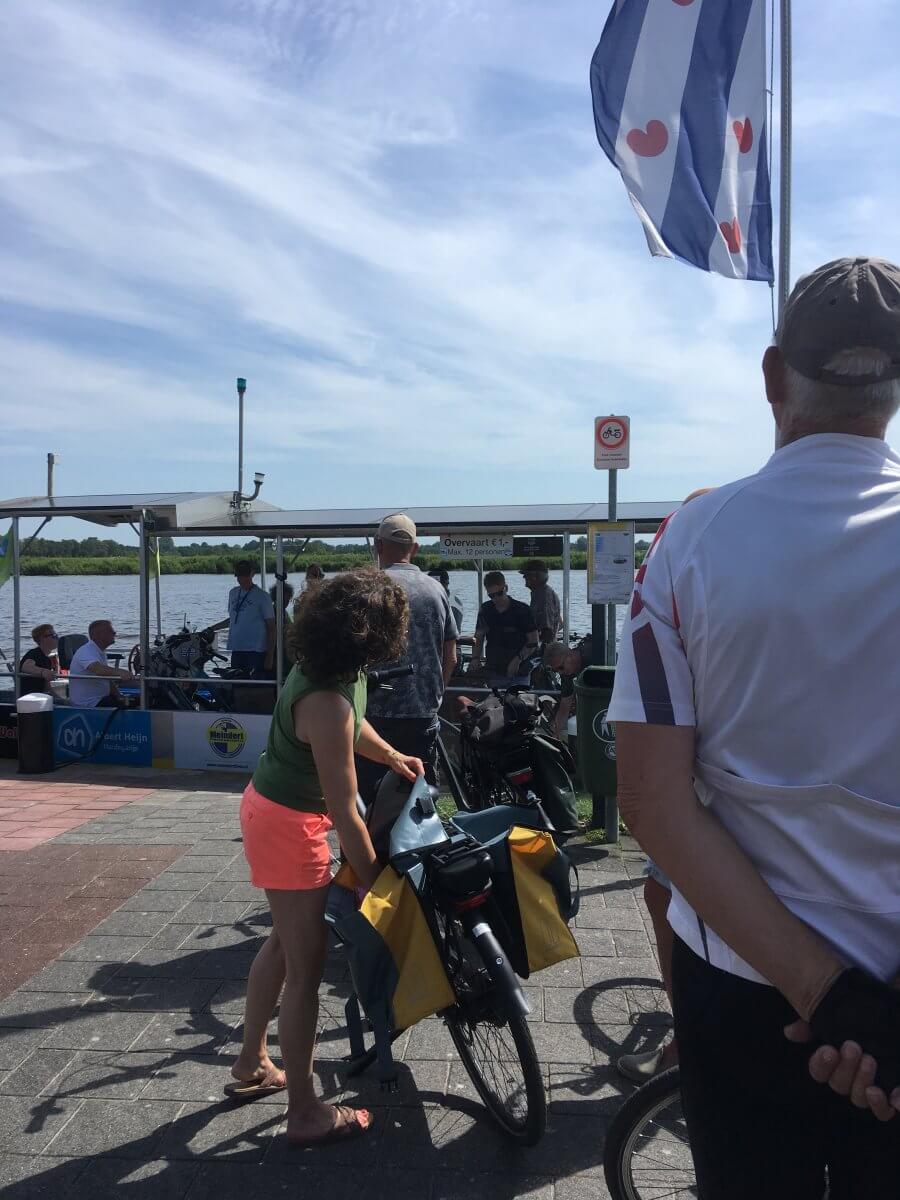 Die Friesche Vlag weht auch überm Pontje, vor dem sich die Regattaradler*innen friedlich und freiheitlich stauen. Gedrängelt wird nicht, hab ich in den vier Wochen Niederlande, egal ob Stadt, Land oder Fluss, kein einziges Mal erlebt, das ging erst in Ostfriesland wieder los.