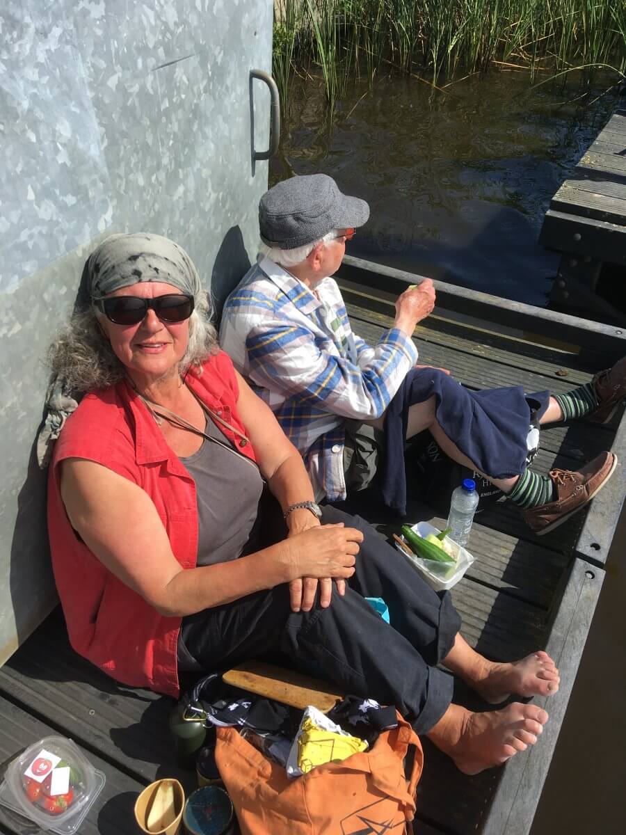 Ihr Mann Pieter hat im Alter von 15 begonnen, die Skutsje-wetstriden mitzusegeln und zehn Jahre lang teilgenommen. Er erzählt, dass die jüngsten dieser Boote von 1910 stammen, dass früher damit unter anderem Zuckerrüben transportiert wurden. Aukje erzählt, dass, nachdem ihre ersten Gäste „black tea“ bestellt hatten, und sie nicht wusste, was sie servieren sollte, erstmal ihre Englischkenntnisse aufpoliert hat, und führt mich durch ihren Garten.