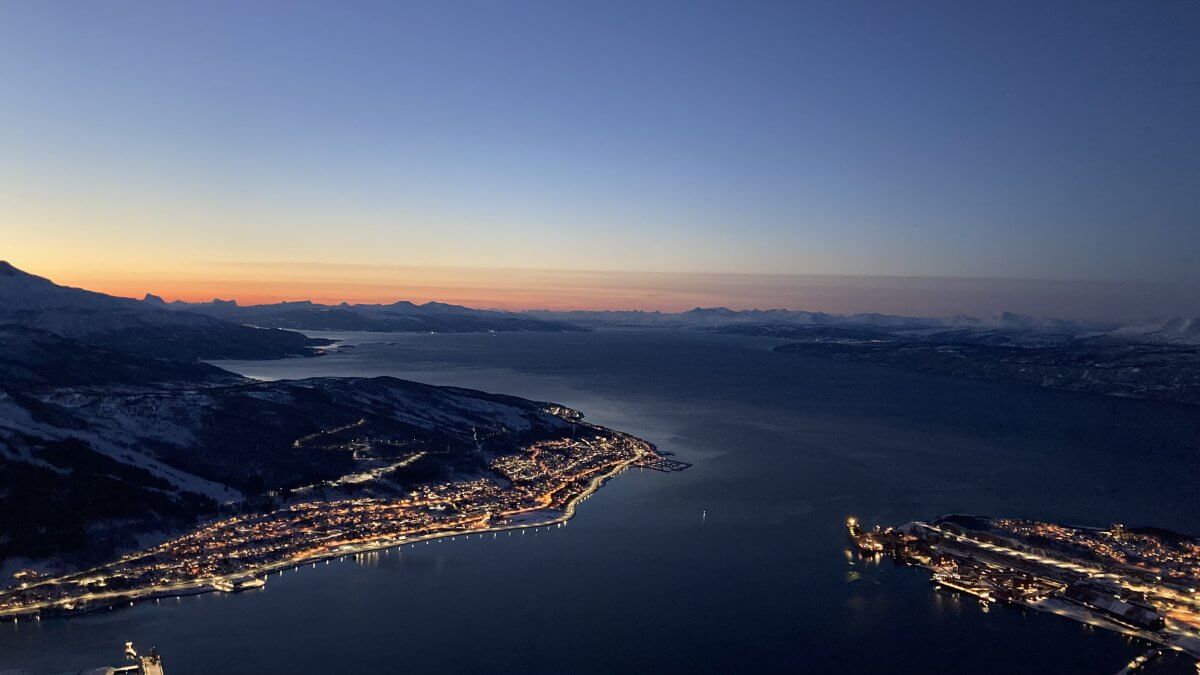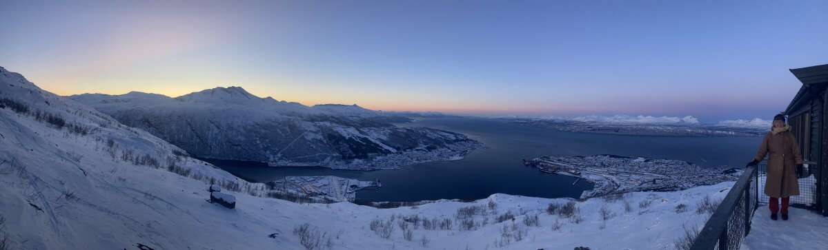 Zurück auf unsere Wege Ende 2023. Dort oben sind sie neben Bürgersteigen, wenn eine so eine nur mit Spikes zu überwindende alpine Piste so nennen will, auch Loipen, auf denen die Skifahrer*innen Vorfahrt haben. An feinen Studentenheimen von Norges arktiske universitet (UiT) und Villen vorbei gelangen wir zur Gondelbahn. Die Aussicht von der Terrasse der Peisestua (Kaminstube): Sehen Sie selbst.
