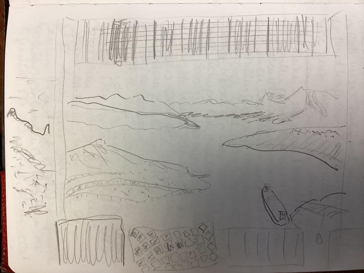Ich gucke aus dem Fenster der Kaminstube in Richtung Lofoten. Die Sonne beleuchtet, quasi aus dem Off hinterm Horizont, über den sie an diesem Tag nicht gestiegen ist, Berge wie den Skittendalstinden (1306, tind bedeutet Zinne, Gipfel) am nördlichen Ufer des Ofotfjordes .