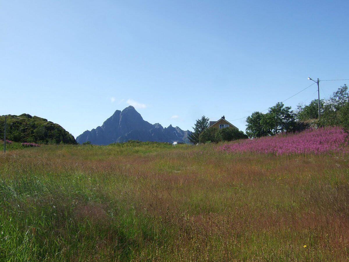 Aufgrund der „dicken kulturellen Unterlage“, so heißt es in der norwegischen Bildunterschrift, aus Erde, die angereichert wurde, seit hier eine Stadt entstand, würden die Pflanzen an der Stelle, wo sich Vágar befand, besonders üppig wachsen, Harald Groven – Eget verk, CC BY-SA 3.0