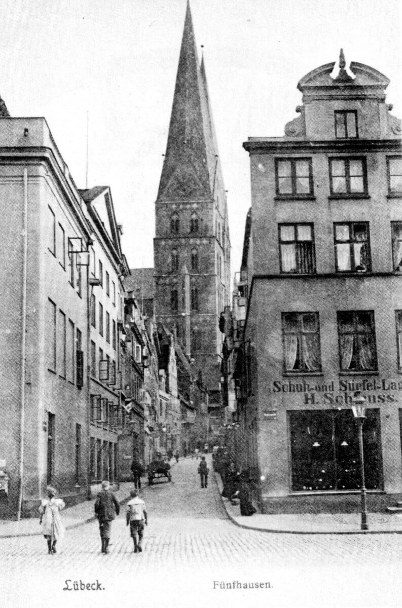 Von ihr lerne ich in kürzester Zeit jede Menge: TORKUHL, heute heißt es Fachgeschäft für Unterwäsche – Bademoden – Home- & Nightwear, gibt es seit mehr als 250 Jahren. Bis zur Bombennacht im März 1942 befand sich das Stammhaus der Firma C. G. Torkuhl in Fünfhausen. Diese schmale Straße in der Lübecker Altstadt wurde 1290 erstmals erwähnt, sie verbindet die Beckergrube mit der Mengstraße, wo der karierte Koffer gerade im 4. Stock, schon fast über den Dächern, in der Jugendherberge steht, wo ich in uralten Gemäuern eine sehr stille Nacht hatte. Der ursprüngliche Standort meines neuen alten Wäscheladens heißt nach einer Ratsherrenfamilie, die Vifhusens hatten auch die Finger im Spiel bei der deutschen Beherrschung der Liven, Esten und Letten, das führt jetzt zwar in die Gegenden meiner Vorfahren, aber hier zu weit. Fünfhausen wurde beim Luftangriff auf Lübeck 1942 fast vollständig zerstört.