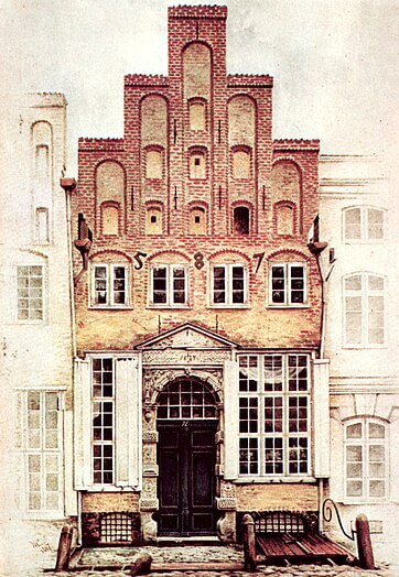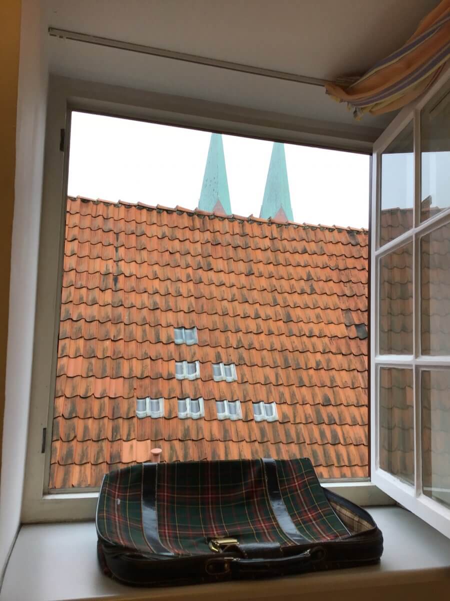 Bei mir ist diese Straße – das mit John Müller wusste ich vorher auch nicht -, deren historische Bebauung mit Häusern wie auf dem Aquarell von 1847 im unteren Teil, also nahe der Untertrave, weitgehend erhalten blieb, wegen der Nummer 33 berühmt. Dort finde ich hin, auch wenn Busse das Innere der Altstadt-Insel gerade großräumig umfahren. Transportiere meinen karierten Koffer, mit dem ich seit fast einem Jahrzehnt zwischen Amsterdam und Krasnojarsk, Tromsø und Astana unterwegs bin, wenn es geht, mit der Eisenbahn, vom Lübecker Bahnhof über den Linden- und den Holstentorplatz und die Holstentorbrücke und schlage mich dann nach links. Eingecheckt werde ich wie eine alte Bekannte und erklimme die steilen und hohen Treppenstufen zu meinem Einzelzimmerchen mit Blick über Lübecks rote Dachziegel. Wie still und friedlich es ist!