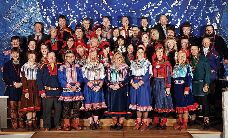 Hab aber erstmal keine Zeit für meine karges und exquisite Klause da oben, muss gleich weiter zum Klingenberg. Auf dem laufen Pferdemarkt, Sand-, Mühlen-, Aegidien- und Schmiedestraße zusammen. Auf der Bank vorm wie ein leuchtendes Iglu erscheinenden InfinityDome stärke ich mich vor der IMMERSION 360 Grad darin mit einer mitgebrachten heißen Linsensuppe. Und mein Banknachbar, ein Mann mit dicken blonden Locken und einer Flasche Korn sagt: „Wir kennen uns aus Altona-Altstadt, über Angie“. Das knallbunte und hinreichend chaotische Hamburger Quartier Altona-Altstadt ist seit einem Jahrzehnt der Ort meiner ökologisch-sozialen Draußenarbeit mit allen anwesenden Wesen. Der rückt mir sofort in weiteste Ferne, als ich eine Frau in einer samischen Tracht erblicke. Bin in den hohen Norden gebeamt, nach Sápmi, wo Sam*innen leben – und tolle Filme machen. Und irgendwie kommt mir ihr Gesicht so bekannt vor! Sie trägt kofte, eine samische Tracht. Es gibt viele davon, wie auf dem Foto der Repräsentant*innen von sametinget, dem samischen Parlament zu erkennen: