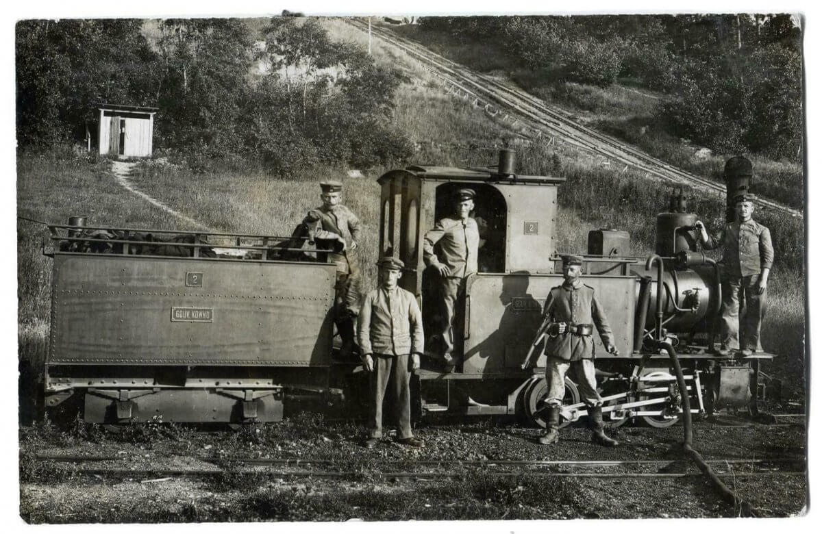 Deutsche Besetzung des Zaristischen Gouvernements Kowno 1915, Deutsche Soldaten in der mit der Feldbahn-Dampflokomotive Nr. 2 mit der Aufschrift Gouv. Kowno wohl bei Aukštoji Panemunė, 1915