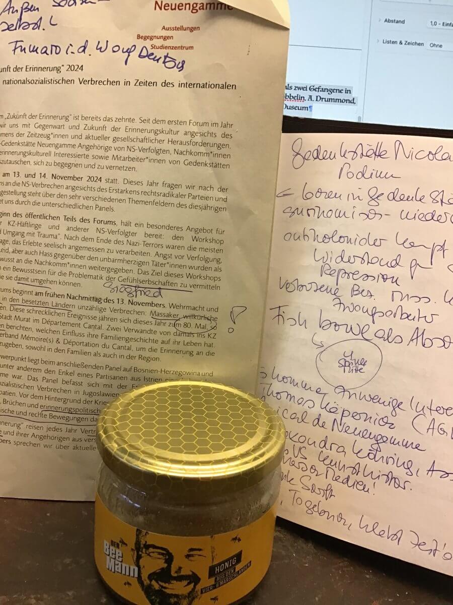 Dieser Honig sei besonders süß und lecker, betont er und holt ein wenig aus – meine Tochter, die draußen wartete, sagt immer ein wenig neckend, ich würde überall den Betrieb aufhalten, nein, ich bringe, so glaube ich fest, mit solchen Gesprächen etwas voran, was es sein könnte, weiß ich vorher auch nicht, bleibe da immer möglichst offenherzig. So erfuhr ich schon vorm Forum über Lachen in Gedenkstätten! Das war das Thema, zu dem mein morgendlicher Gesprächspartner vor Kurzem von einer Soziologin interviewt worden war. Das ist nämlich erlaubt – und beflügelt die Erinnerungskultur ebenso wie die intensive Anbindung an zeitgenössische Vögel und Insekten vor Ort.