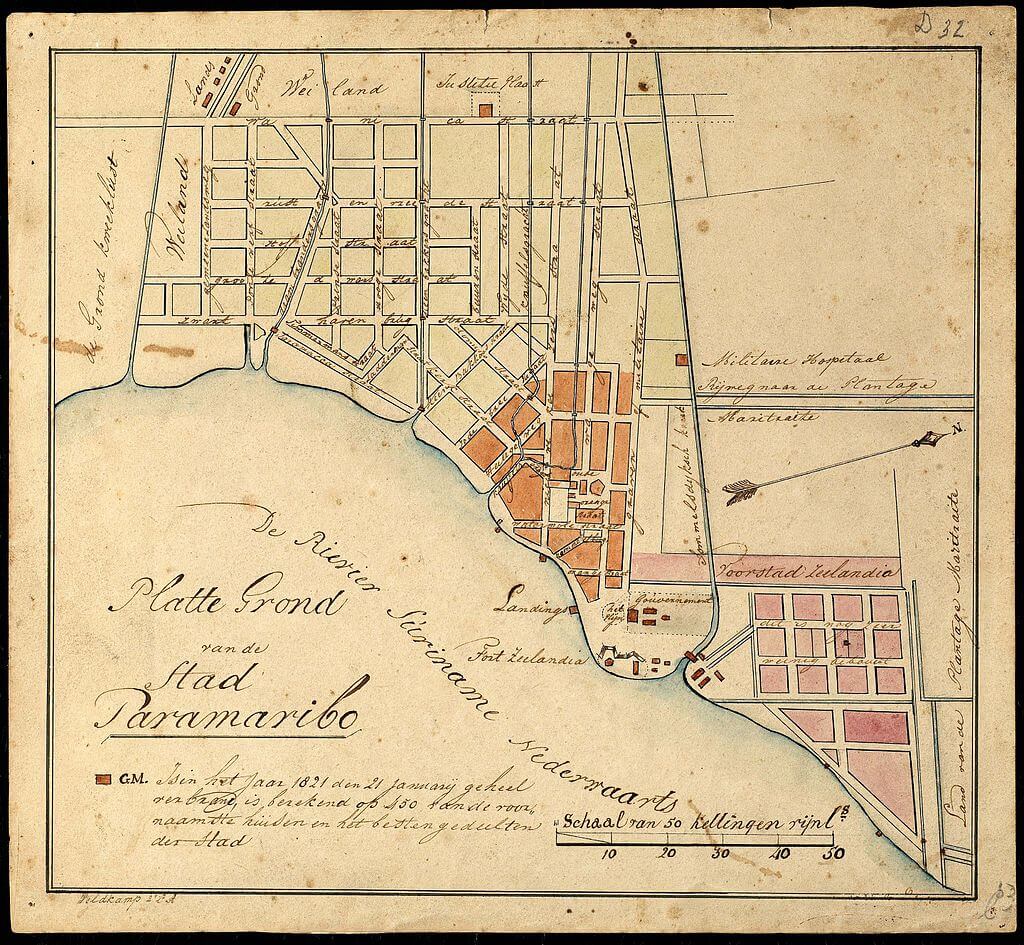 Paramaribo in Suriname, Stadtplan von 1821, im Fluss dort trainierte der junge Langstreckenschwimmer Waldemar Nods, der Großvater von Max Nods, Veldkamp – Geheugen van Nederland
