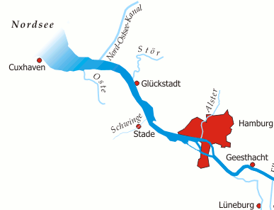 Noch eine grobe Ortung an Mudda Elbe, wie ich „meinen“ Strom nenne: Die Unterelbe, vor Ort in Abgrenzung zu ihren stillgelegten Armen Dove- und Gose-Elbe auch „große Elbe“ genannt, ist der von Ebbe und Flut beeinflusste Stromabschnitt zwischen Nordseebad Cuxhaven und Geesthacht, das sich auf dem höhergelegenen Geestrücken am Rande des Urstromtales befindet.