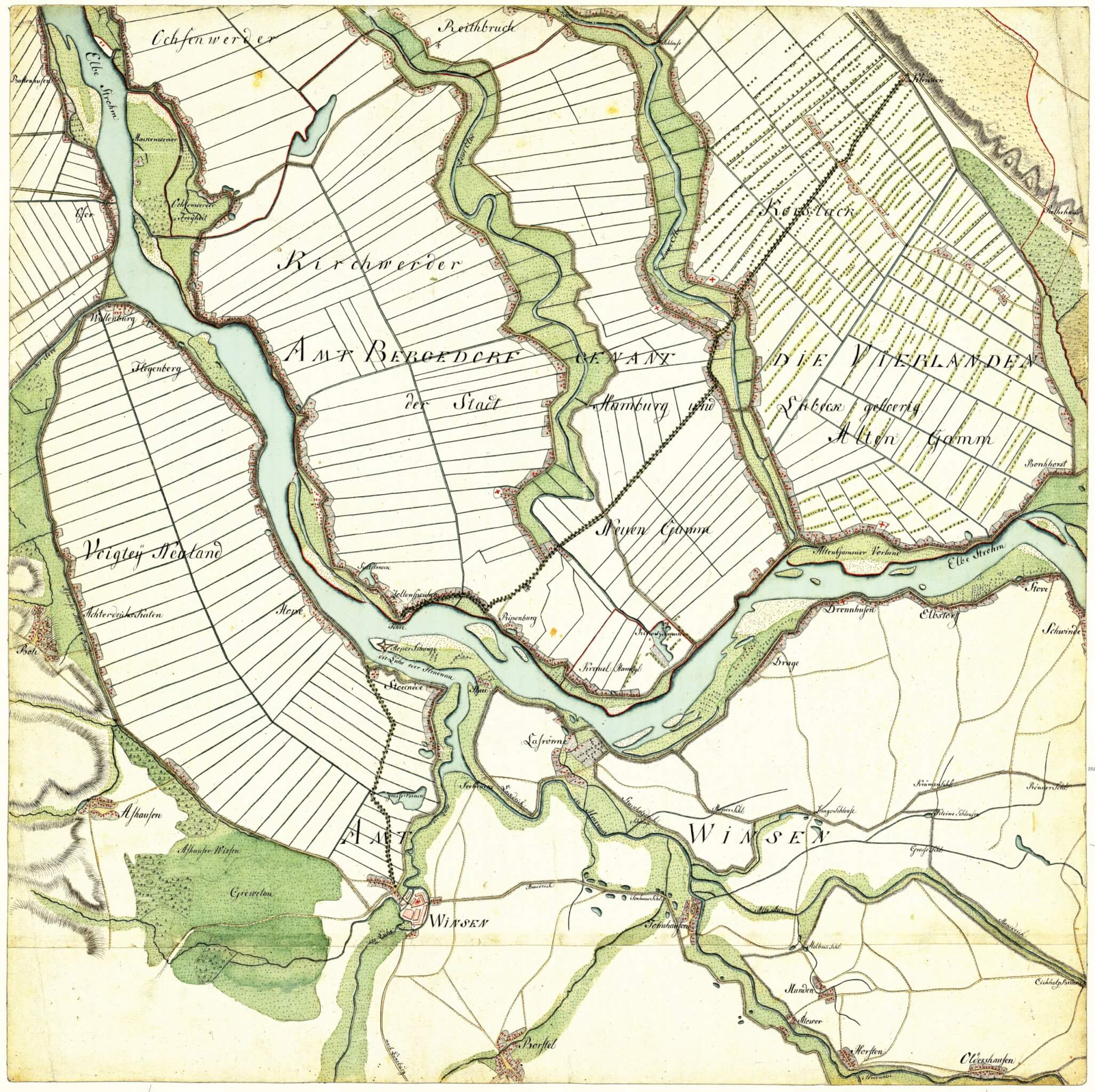 Kleine Karte der ausgedehnten „gestreiften“ Vierlande am nördlichen Elbufer, von links nach rechts die namensgebenden vier Dörfer Kirchwerder, Neuengamme, Curslack und Altengamme, 1420 von Hamburg und Lübeck erobert, seit 1868 – bis auf einen Teil Kirchwerders, der bis zum Inkrafttreten von Hitlers Groß-Hamburg-Gesetz (der von so vielen als Führer Bejubelte hatte ganz Großes mit der Hansestadt vor) im Jahr 1938 preußische Exklave war – allein zu Hamburg gehörig, um 1790, Gustav Adolf von Varendorf