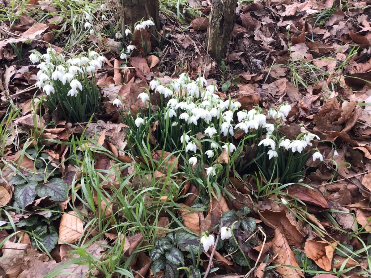 Märzenbecher blühen nur an besonders günstigen Standorten schon im Februar. Günstig wird hier auf Hof Eggers der Mull unter der Laubdecke sein, die hier niemand wegbläst außer dem Wind. Mull bildet sich vor allem in Auwäldern und krautreichen Laubwäldern (unter Laubbäumen gedeihen im Gegensatz zur Fichtenmonokultur auch andere Pflanzen) und ist der beste Humus, den es gibt. Humus ist ja die organische Substanz des Bodens, alles, was von abgestorbenen Pflanzen und Bodentieren nach gründlicher Zersetzung übrig bleibt: Nahrung und Lebensraum für die nachfolgende Flora und Fauna. Die Märzenbecher habens gut auf Hof Eggers und können ihrerseits so früh im Jahr den ersten Wildbienen und Tagfaltern, die durch ihren veilchenartigen Duft angelockt werden, ihrerseits Nahrung bieten.