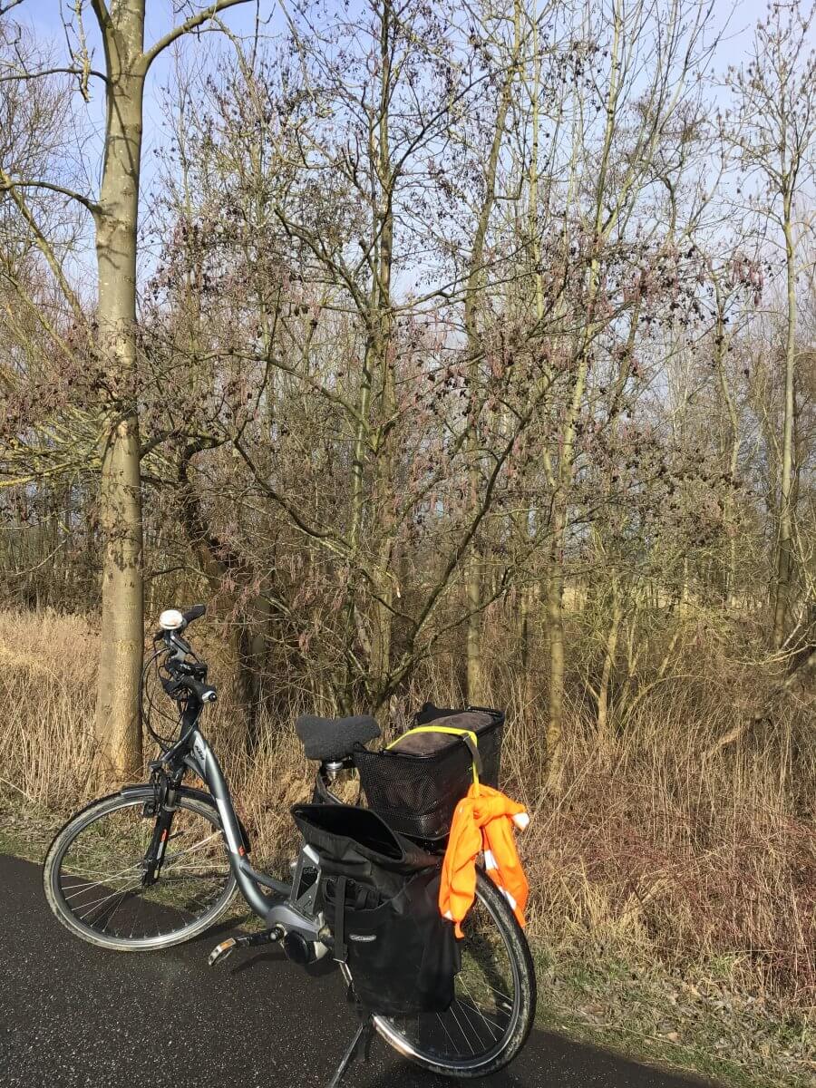 Der graue E-Esel kommt nicht weit, an der Südwestecke von Hof Eggers, neben dem Kirchwerder Marschbahndamm wollen erstmal die Erlenkätzchen bewundert werden (Erlen hatten wir schon ausführlich, siehe voriger Blog)