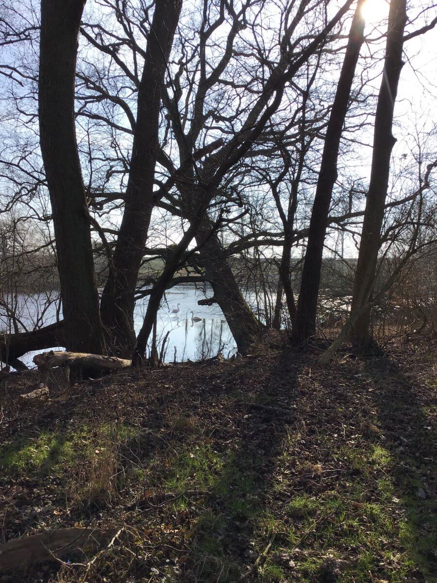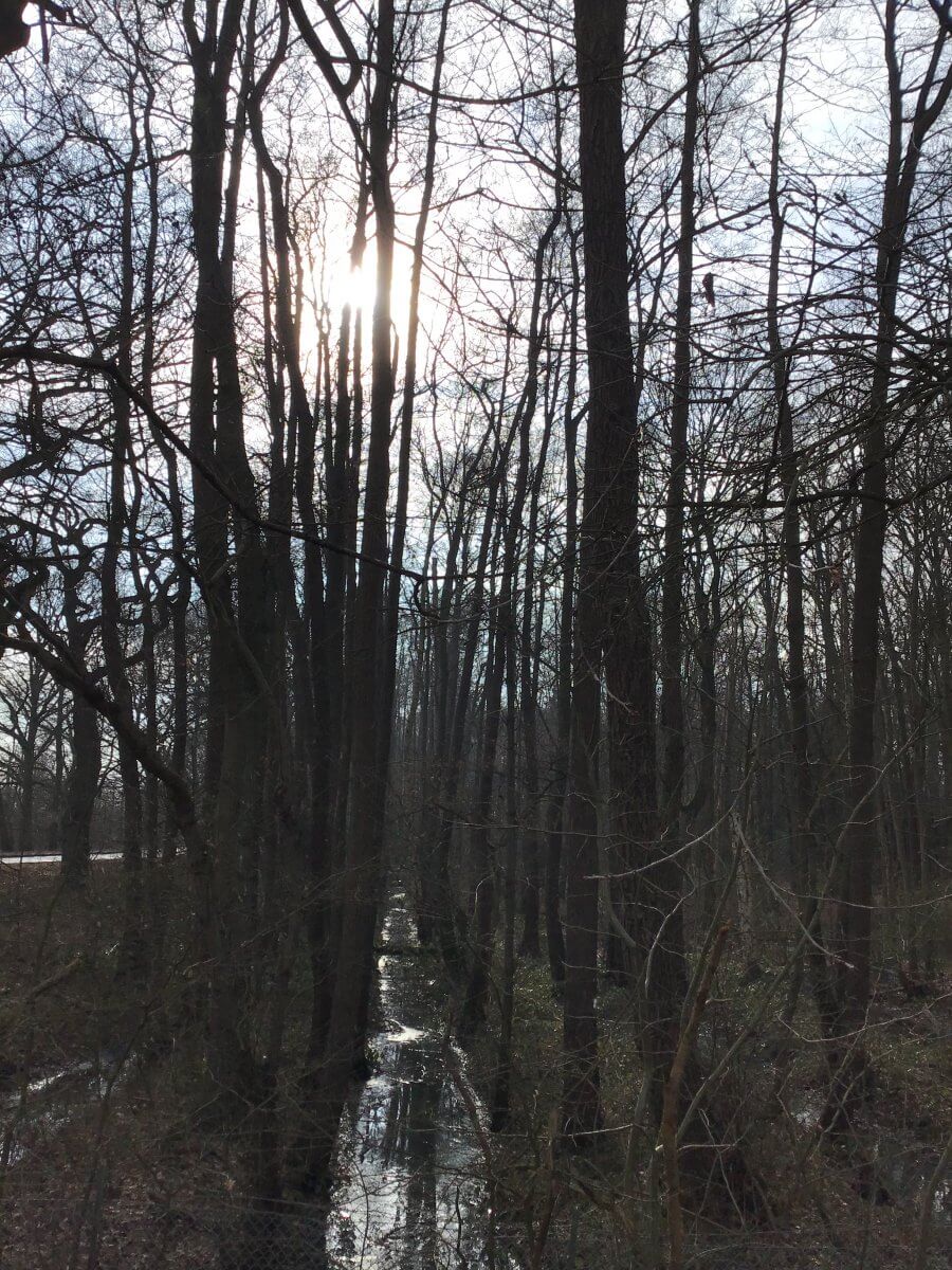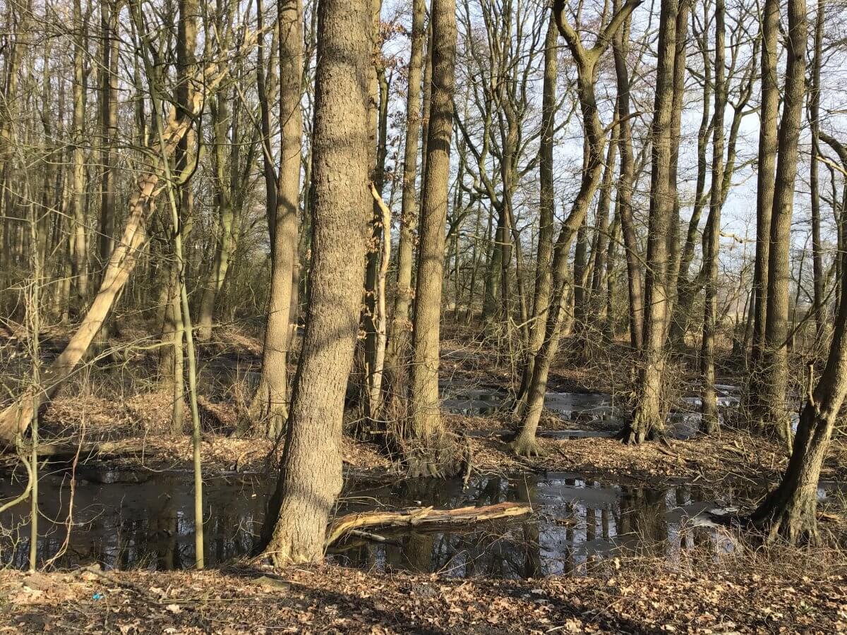 Ein Stück weiter westlich leuchten mir meine Lieblingsbäume, die Birken in der plötzlich richtig warmen Sonne. Ich fotografiere im Bruchwald am Kirchwerder Mühlendamm die Senken, die beim Aushub von Kleiboden, der sich dafür besonders gut eignet, für den Deichbau entstanden sind.