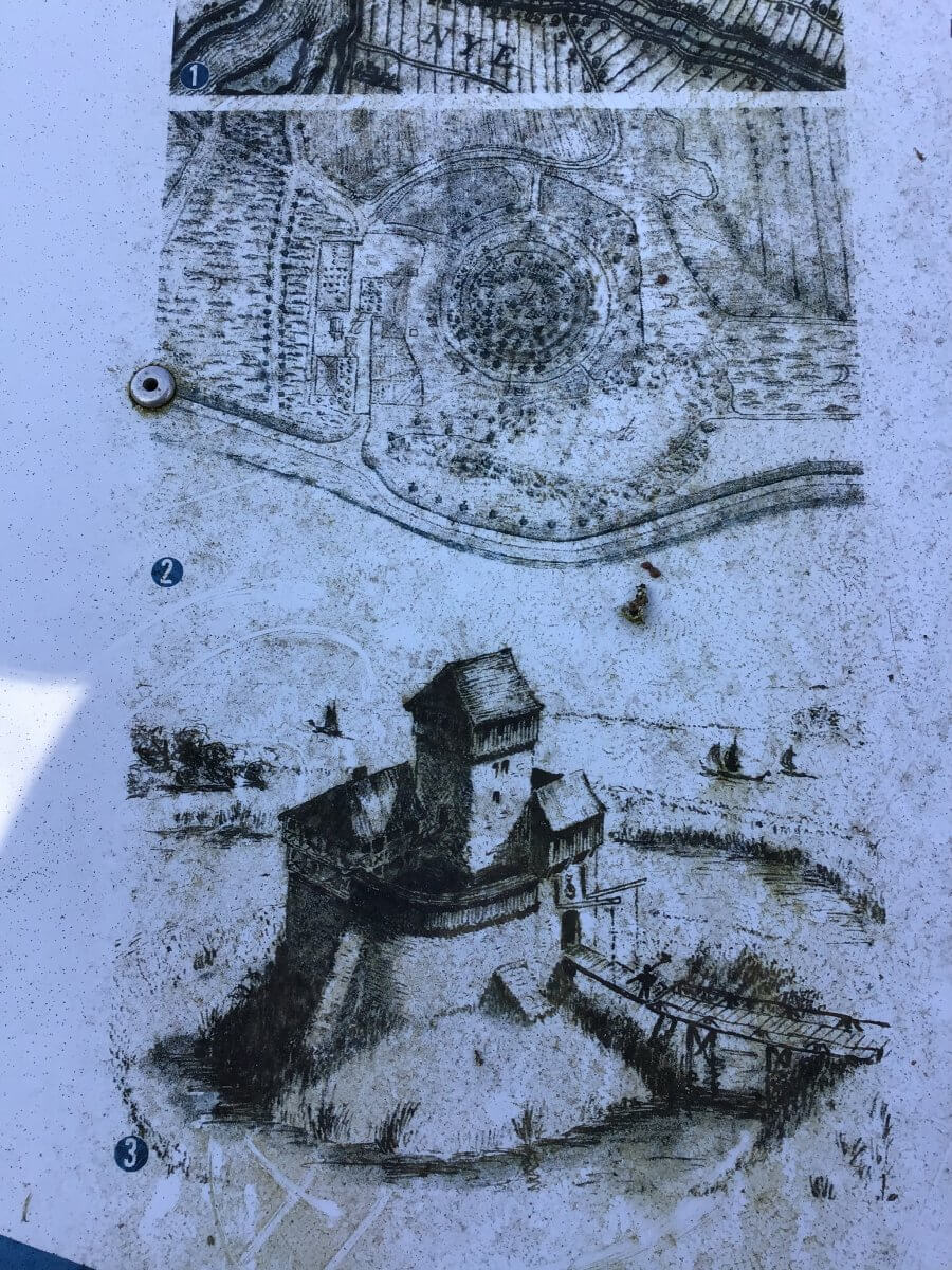 Wenn von einer Burg – wie dieser Turmhügelburg an der Elbe – weniger übrigbleibt als eine Ruine, sprechen Fachleute von einer abgegangenen Anlage. Diese Hinweistafel auf dem gut versteckten Wanderweg ist archäologisch betrachtet, noch nicht abgegangen, hat aber schon viel Patina angesetzt. Abbildung 2 zeigt die Befestigung der Riepenburg – ihre militärische Aufgabe war der Schutz der Zollstelle, im 15. Jahrhundert Toln Spieker, auch Tole Spieker, Tollenspieker oder Op´n Spieker genannt – im 18. Jahrhundert; Abbildung 3 den etwa ab 1250 auf einer Erdaufschüttung errichteten Turm.