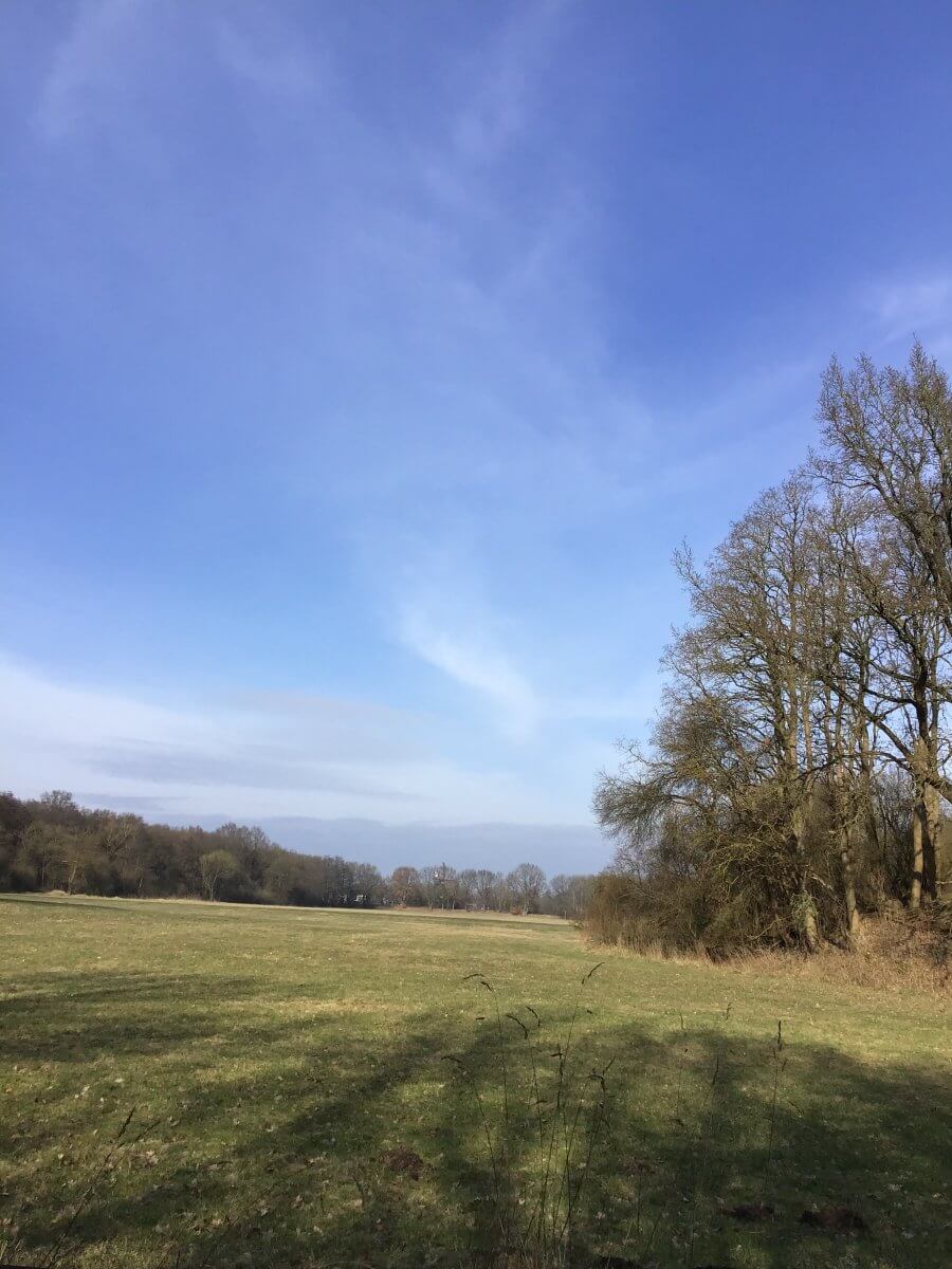 Von der fast eingewachsenen Bank blickt eine auf 600 Jahre Agrargeschichte (lückenlos dokumentiert im Hamburger Staatsarchiv), ganz im Hintergrund ist bei genauem Hinstarren die Riepenburger Mühle zu erspähen.
