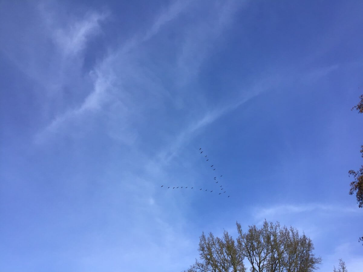 Ich belebe beim Pflücken meine antibakterielle und entzündungshemmende Hautbarriere, lasse mir die die bitteren Blättchen appetitanregend auf der Zunge zergehen, mir den Rücken von der Sonne erwärmen und picknicke auf der einsamen Bank beim Riepenburger Brack. Da ertönen hoch über mir Schreie. Mein Herz jubelt, ich werfe den Kopf in den Nacken und erblicke im hohen blauen Himmel die Pfeilformation. Die Kraniche kommen!