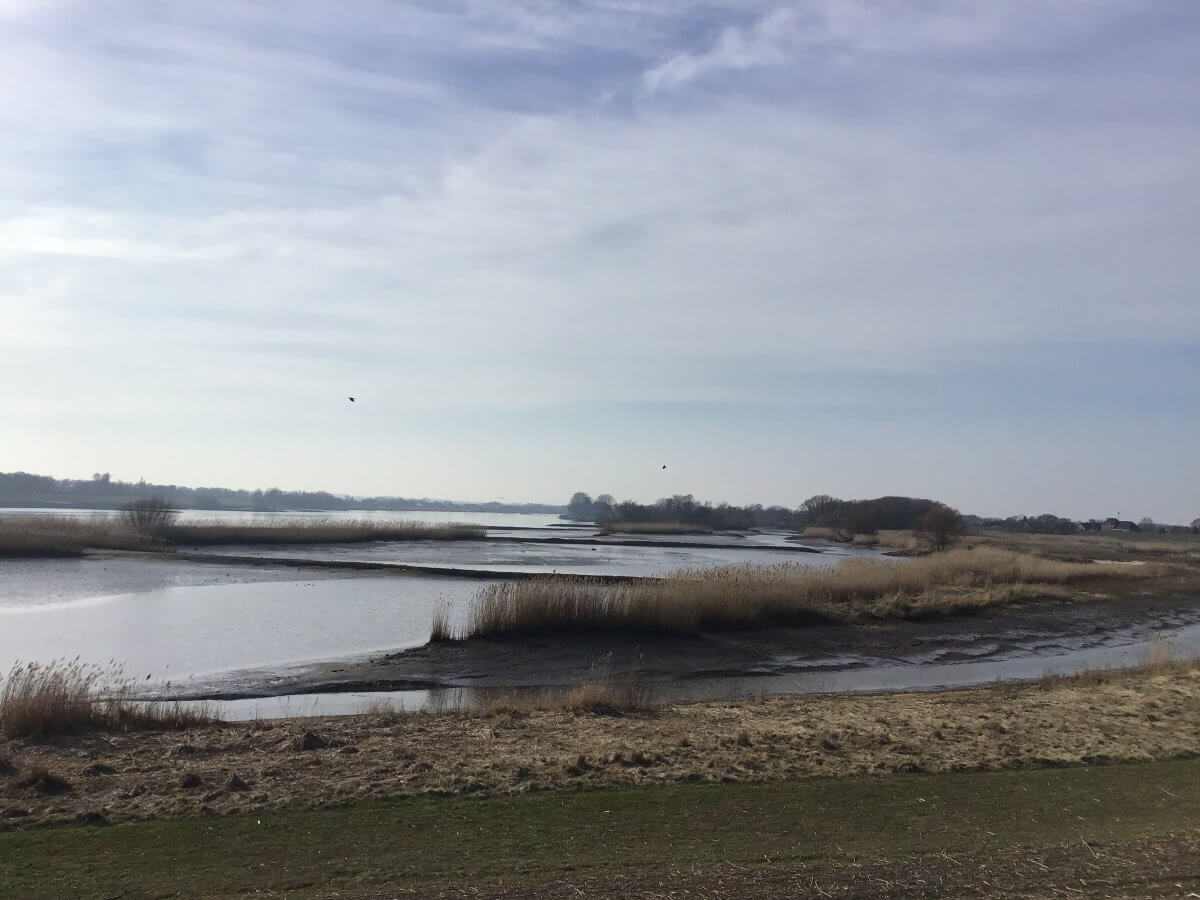 Beglückt und gestärkt steige ich wieder aufs Rad. Und komme nicht weit. Dieser Ausblick, wenn auch ein wenig grau, lässt mich innehalten. Vor mir liegt nämlich ein Süßwasserwatt, ein besonders kostbares Biotop. Die Grautöne stammen u.a. vom Elbschlick, der zum Teil frei liegt.