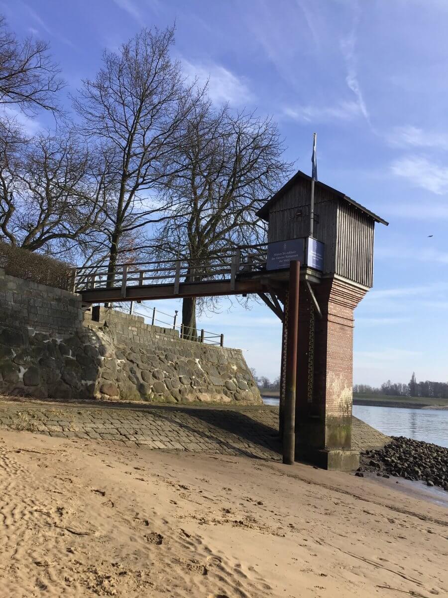 Die Grundmauern hinter mir sowie die Fährverbindung gehen auf das Jahr 1252 zurück, im ehemaligen Pegelhäuschen befindet sich heute das angeblich kleinste Restaurant der Welt.