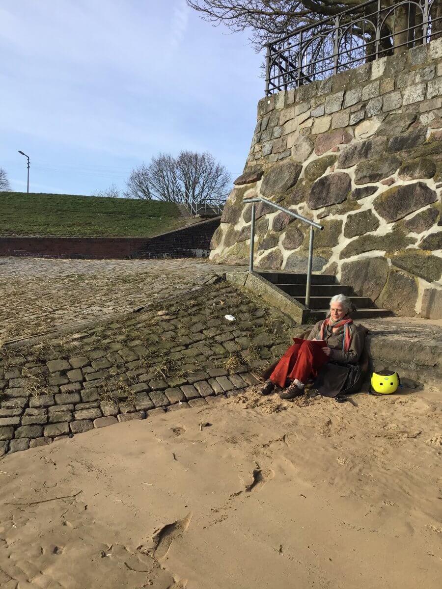 Rechts vom weißen Gasthaus liegt der Zollenspieker Hafen – hier bei Flut -, in dem ich an diesem immer wärmer werdenden Nachmittag bei Ebbe im Elbsand in der Sonne sitze. Damit hatte ich nicht gerechnet.