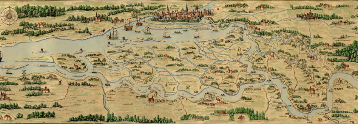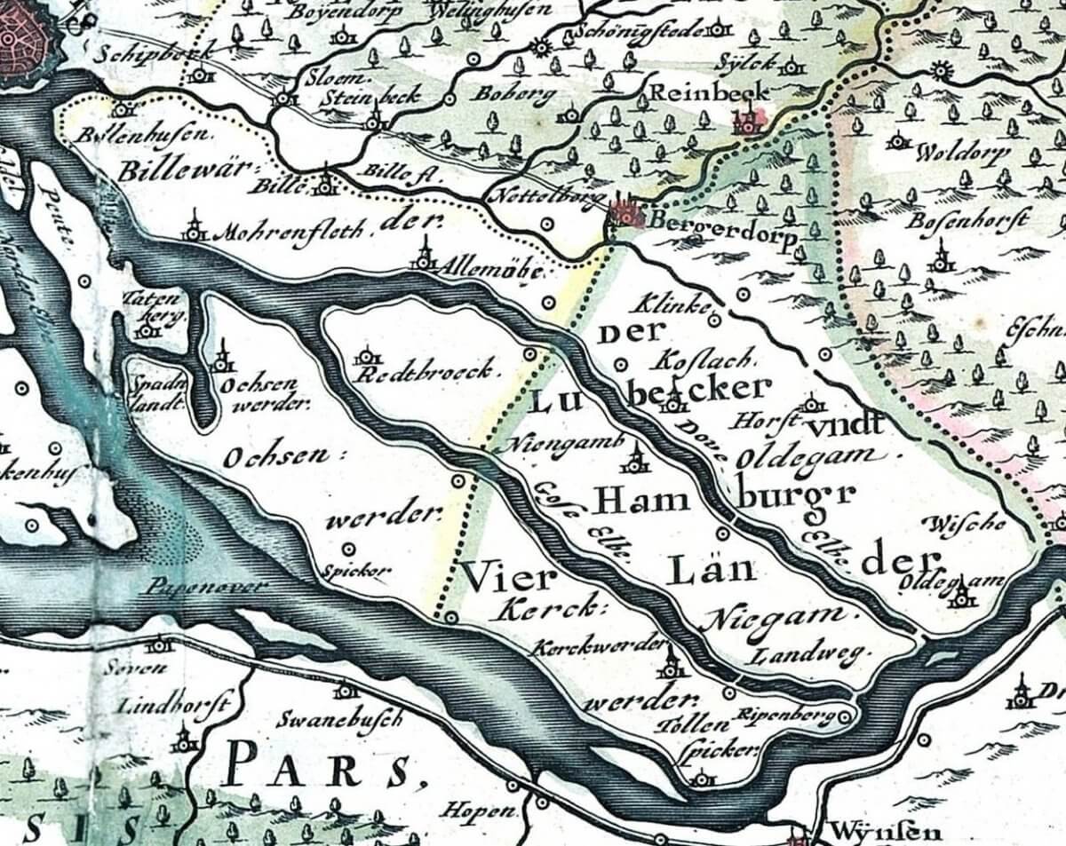 Die Dove-Elbe wurde, wie auf dieser Karte von 1650 zu sehen ist, ebenso wie die Gose Elbe, im 15. Jahrhundert von der Hauptelbe abgedämmt, um das Fahrwasser des Hafens zu verbessern. Seit 1579 gibt es an ihrem anderen Ende die Tatenberger Schleuse, Johannes Mejer
