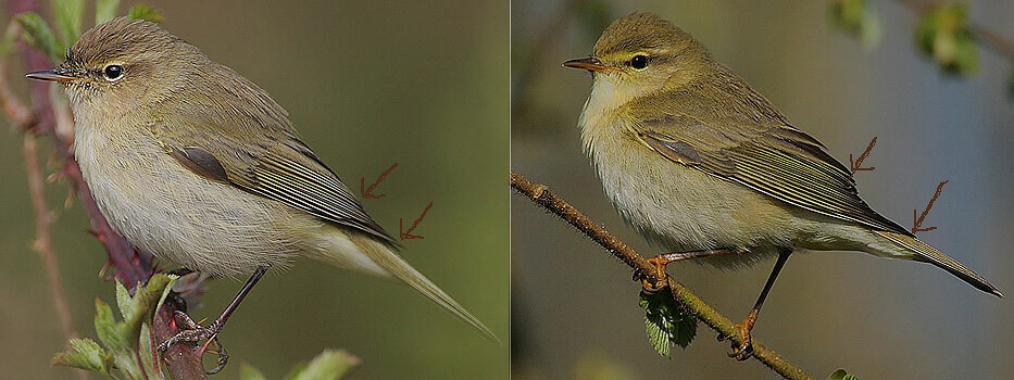 Optisch eher unaufflällige Sänger: links Phylloscopus collybita, Zilpzalp, auch Weidenlaubsänger genannt, rechts Phyllospopus trochilus, Fitis, Steve Garvie, Schottland