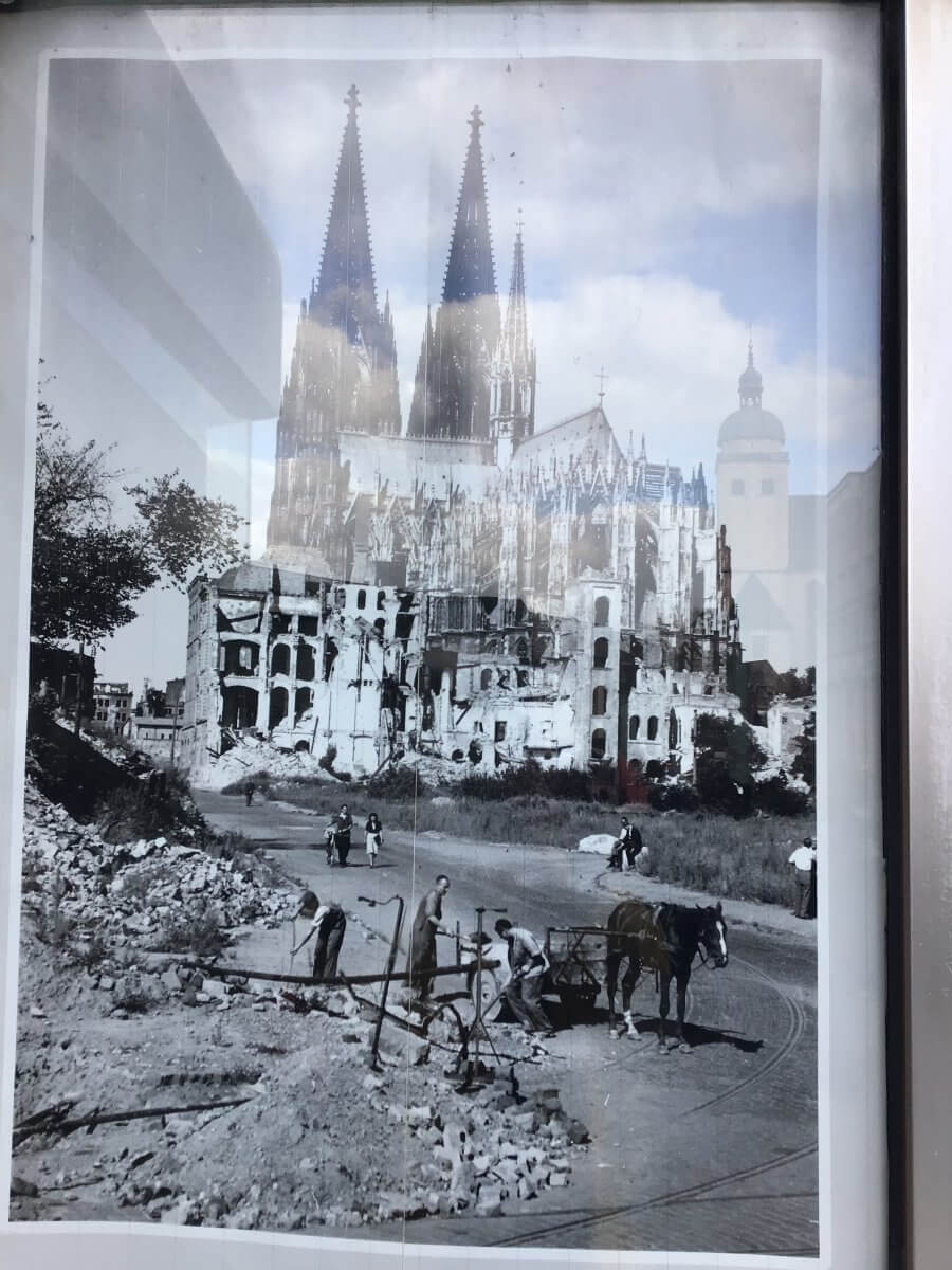 Wenn eine gleich beim Bahnhof auf die Domplatte steigt, kommt sie nicht an diesem alten Fotogeschäft am Dom vorbei, bei Lambertin. Der Firmengründer begann seine Karriere als Pressefotograf. In den Schaufenstern hängen Bilder der zerstörten Stadt, wo er 1949 sein erstes Fotofachgeschäft eröffnete, unter der Hohenzollernbrücke (siehe oben).