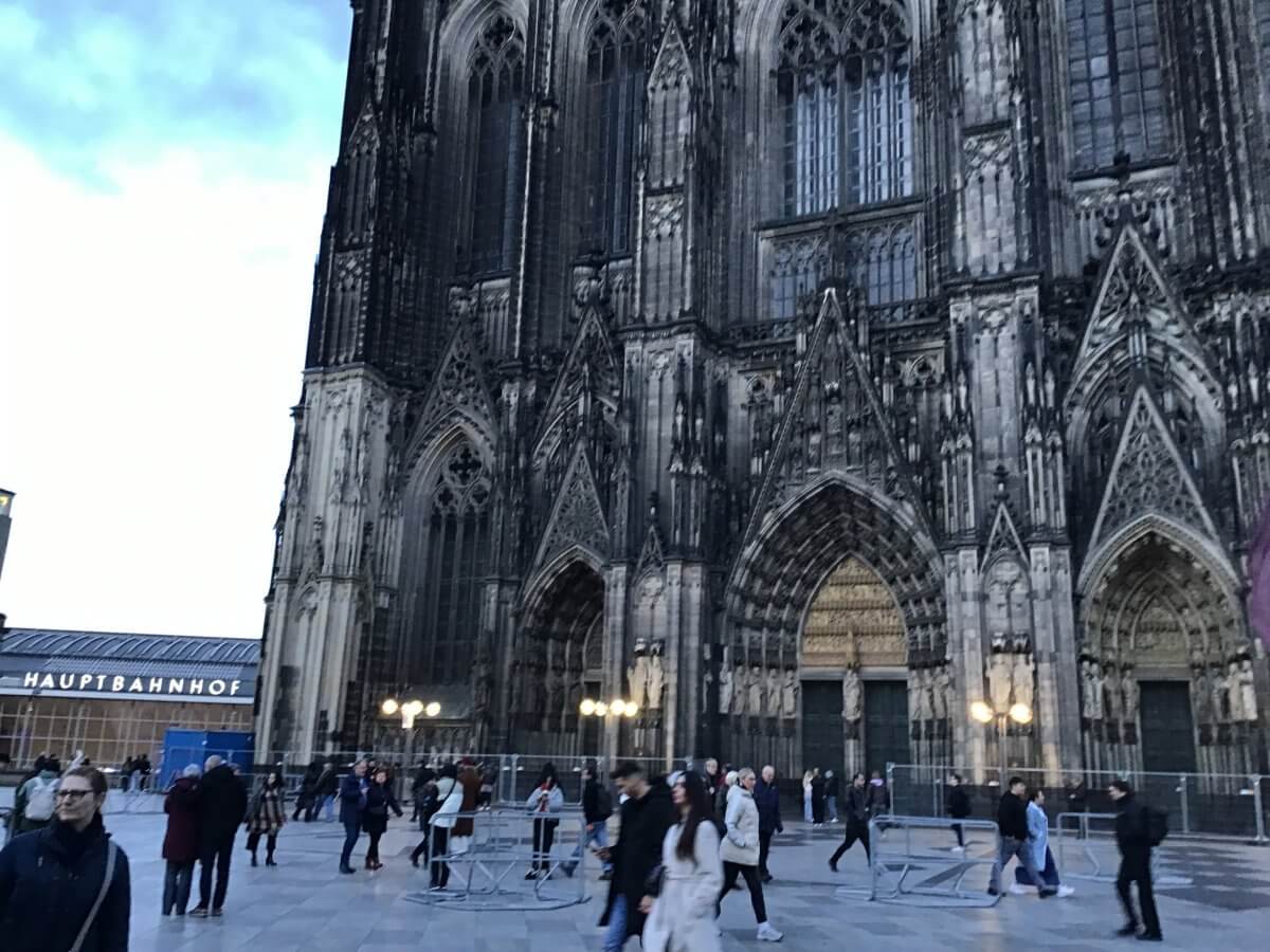 Wenn eine sich im Zug richtig platziert, bekommt sie auf der schääl Sick, am als schääl abgewerteten Ostufer den Messeturm zu sehen – auf dem begrüßte mich in meiner Kölner Zeit in den 1980ern noch die Leuchtschrift 4711, heute wirbt da eine andere, nicht ganz so dufte Produktionsstätte – und schräg gegenüber erhascht sie so die erste Aussicht op de Dom. Das Icon mit den bedürftigen Karnevalist*innen bedarf keiner Erläuterung, außer: die Stadt muss sich einfach vorm Vollgepisstwerden schützen. Zu meinem persönlichen Kultplatz Alter Markt, auf dem vor 35 Jahren der Widerspenstigen Zähmung, meine von Ritualienmeisterin Edith mit präziser Logistik gesteuerte Initiation in den Kölner Straßenkarneval, müsste ich ein kleines Stück rheinaufwärts laufen, bis zum Fischmarkt, dort dann in die uralten Gassen biegen. In der Richtung, aus der ich komme und in die ich gleich wieder aufbreche, bilden Hauptbahnhof und Dom mir ein zauberhaftes Ensemble: