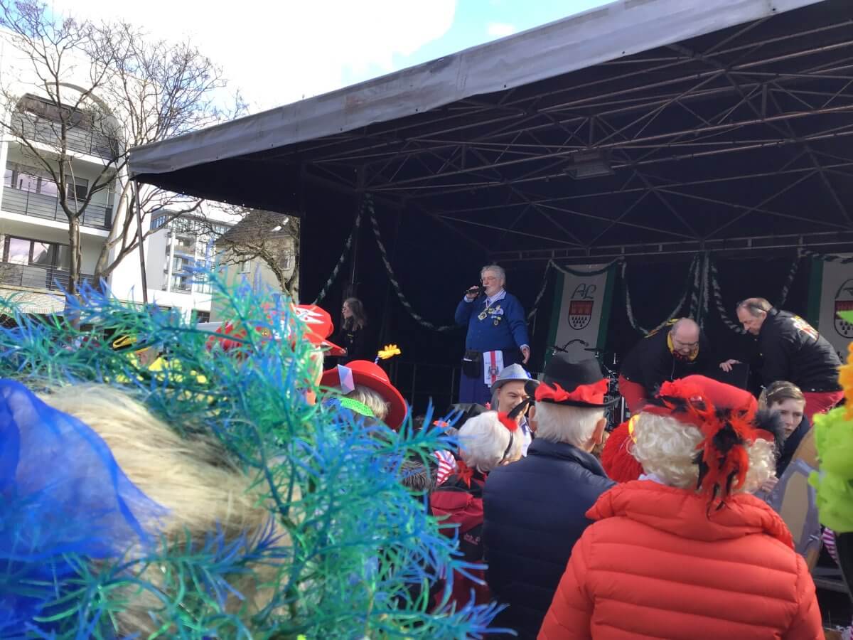 Unser Präsident auf der Bühne (hätte gern mehr solche Präsidenten:)) macht seine Sache heftig und herzlich, feiert ganz ausführlich die lokalen Gruppen aller Art und berichtet, dass er darum gebeten hat, dass dieses Event nirgendwo in den Medien angekündigt wird. Nun mache ich mich wohlmöglich schuldig am Untergang des Stadtteilstraßenkarnevals in Horden als Bloggerin, aber die Leute in Sülz wirken wirklich sehr resilient, die bringen noch jeder/m das friedliche und fröhliche Outdoor-Benehmen bei und wie man Fastelovend fiere dät. Die Kölner*innen aller Herkünfte machen das seit 2000 Jahren. Und ich versinke hemmungslos mit sagenhafter Erbsensuppe und Fassbrause in dieser total unkommerziellen nachbarschaftlichen Veranstaltung der herzerfrischenden Art.
