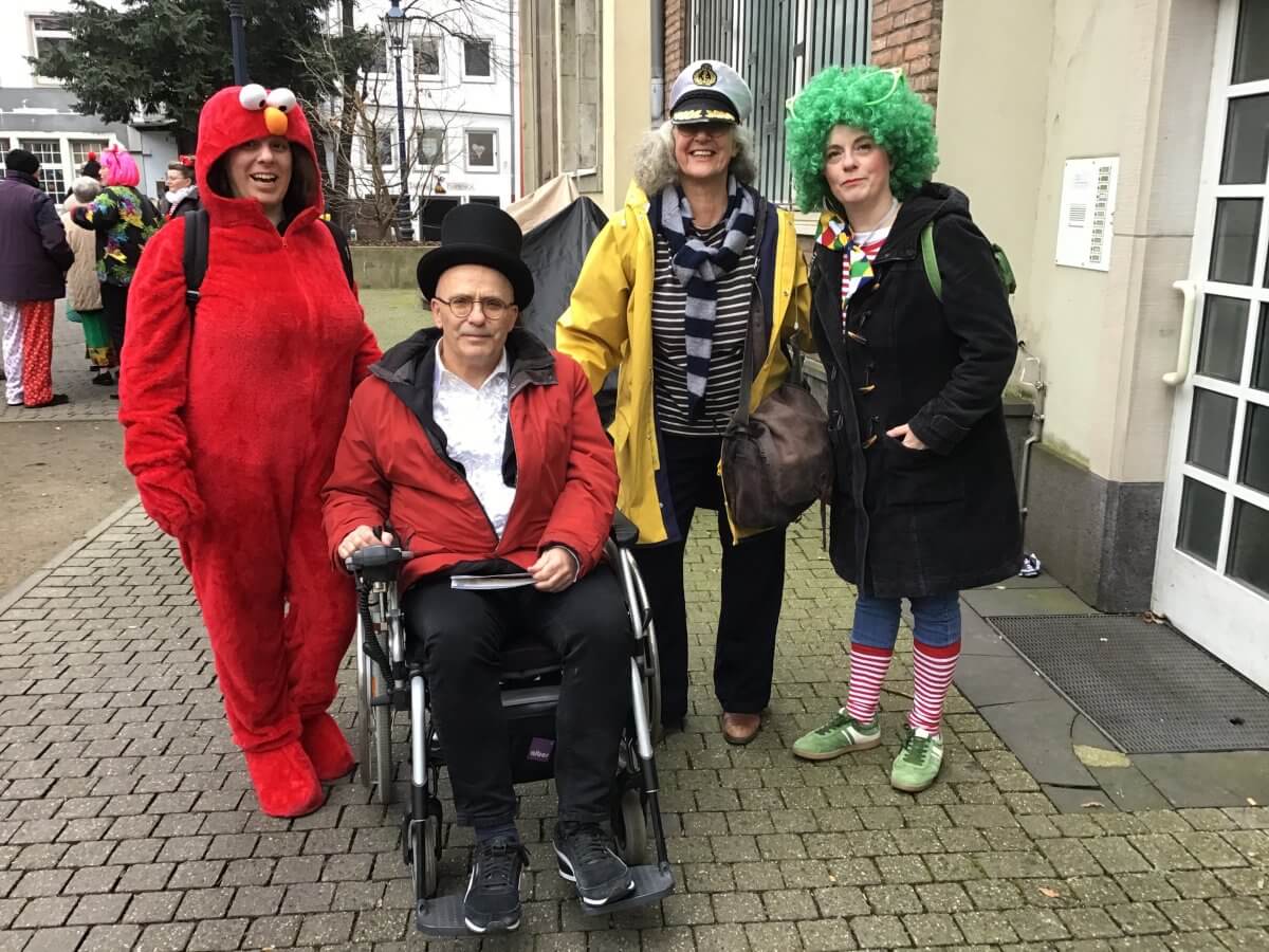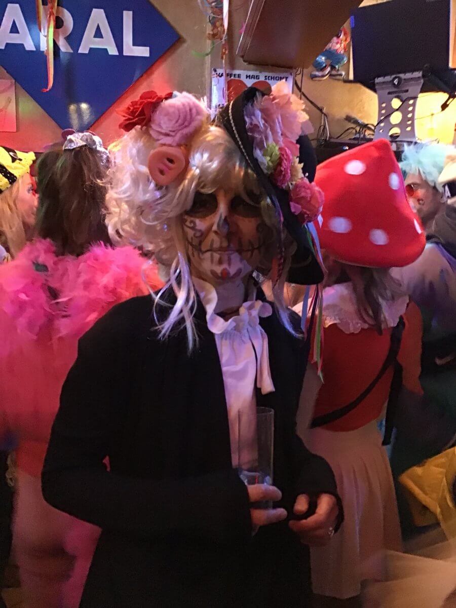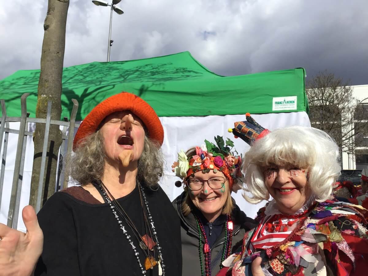Wir lauschen beseelt den Domstädtern, einem Blasorchester, das unser Präsident uns mit den Worten präsentiert: „Wir brauchen hier kein Querbeat“, und seinem Lob dafür, dass alle „nur Lück mitjebrach han, de zo uns passe“, sprich, Leute, die zu uns passen. Und dann fängt es an zu schneien, aus heiterem Himmel. Da sitzen wir aber schon bei Schmalzgebäck im Café. Und ich erfahre nebenbei, dass es nicht mehr so viele Kölnerinnen gebe. Ute, im Kuhkostüm, allerdings ist hier geboren, genauer „im Veedel“, das ist die Südstadt. Und da hat sie sich auch nur unwillig und für kurze Zeit wegbewegt, ist bis nach Weiden, einen Stadtteil am westlichen Rand von Köln. Jetzt lebt sie wieder in der Südstadt. Und wir alle, wir fünf Weiber, leben beim Verzälle (Erzählen) auf. Teilen unsere Aufs und Abs miteinander und lachen uns kapott.