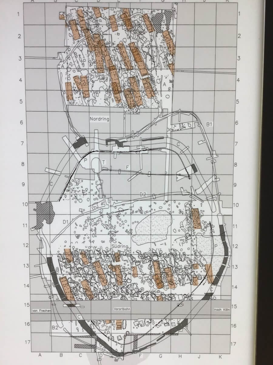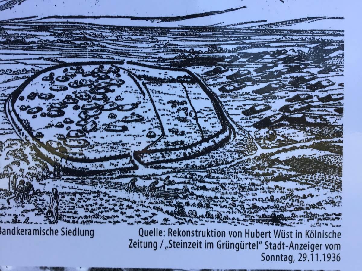 Und dann erscheint mir doch mitten im Belgischen Haus glatt die Stelle, an der ich gestrandet war. Auf der oben abgebildeten Karte befindet sich der Stüttgenhof unter dem Wort Vorortbahn (die heißt heute Linie 7). Ansonsten entführt uns diese Abbildung in die Jungsteinzeit: Mitte des 6. Jahrtausends vor Chr. ließen sich im heutigen Köln-Lindenthal (Ediths Veedel) am sanft geneigten Hang einer Talmulde, die damals der Frechener Bach durchfloss die ersten Ackerbauern nieder. Die oben eingezeichneten Ausgrabungen stellten in den 1930ern eine Pionierfundstelle der archäologischen Siedlungsforschung dar. Das schreibe ich jetzt nur für Marie-Theres, die mich in die Geheimnisse dieser Forschungsrichtung eingeweiht hat, ein wenig.