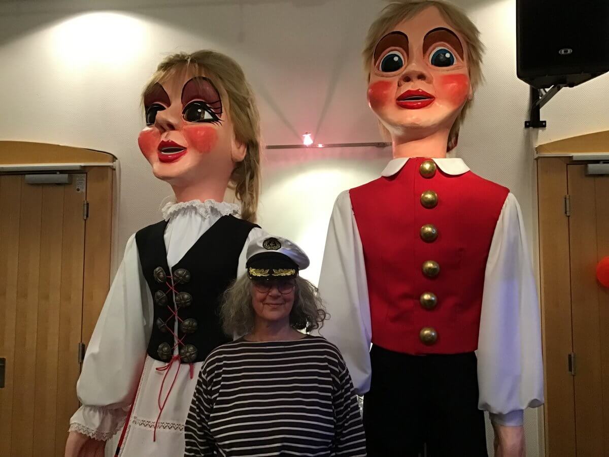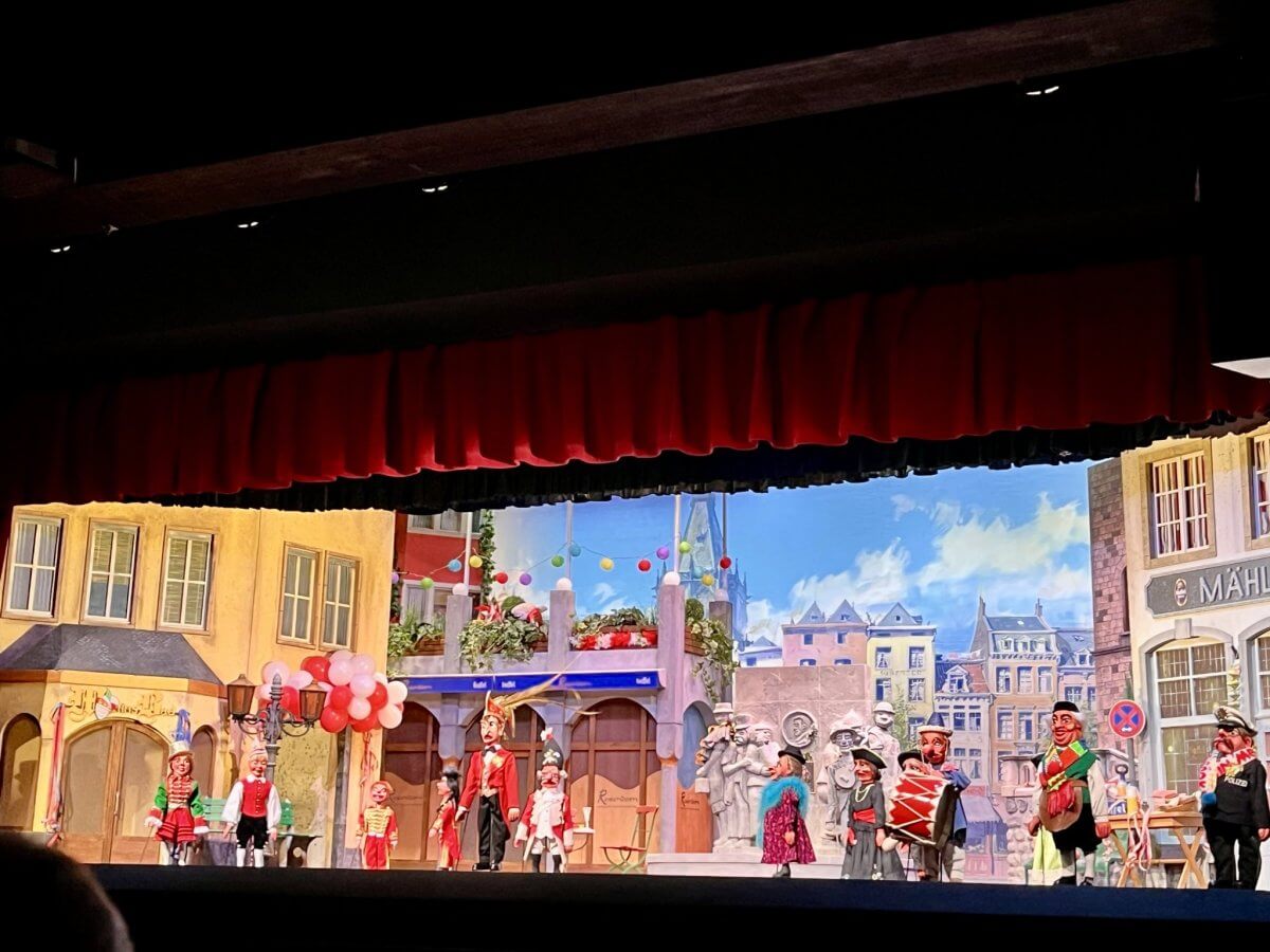 Hänneschen und Bärbelchen haben auch eine Odyssee hinter sich, und natürlich hat das in Köln nur Hänneschen genannte Theater 1802 nicht mit 14 Puppenspieler*innen und insgesamt 25 festen Mitarbeiter*innen angefangen. Das Publikum hat die Stockpuppen Hänneschen und Bärbelchen (s.o.) u.a. trotz anfangs laufend wechselnder Spielstätten treu gefeiert. Höhepunkt der Spielzeit ist die Puppensitzung, eine Persiflage auf den Kölner Sitzungskarneval. Und ich nehme total enthusiastisch neben Anke (oberes Foto rechts, grüne Perücke) in der dritten Reihe Platz. „Statt ze walte in ze lenke, tut jeder an sich selber denke“. Statt zu walten und zu lenken, würde jeder nur an sich selber denken, tönt es aus dem Kasten unter der Bühne direkt vor mir. „So hat es sich erwiese“. Und Merz & Co steuerten nun in die nächste Krise. Hört ihr euch eigentlich selber noch zu? lautet die Frage dann. „Einsparungen an Kitas und Schulen! Seid ihr mies!“ Leute, die an Stellen sitzen, „wo se noch hinjehöre“ würden „ohne Kampf“ wiedergewählt. „Wo ist der James Bond, wenn man ihn brüch?“ Und: „Wer AfD wählt, hat in der Schull zu oft gefehlt.“