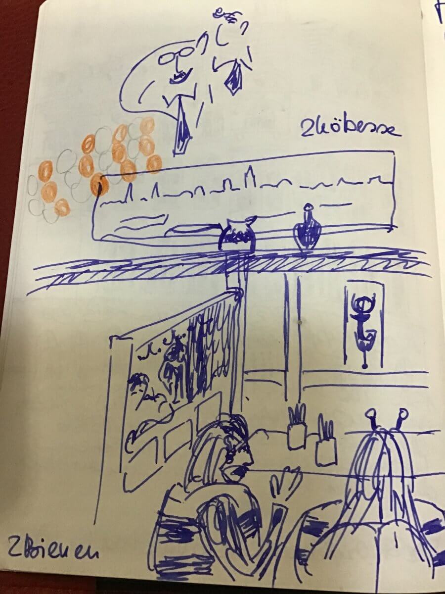 Die Kellner heißen im Früh und in den anderen Brauhäusern Köbesse (Einzahl Köbes). Die Köbesse im Früh tragen blaue Schürze mit umgeschnallter lederner Geldtasche und sind viel weniger ruppig, als geschrieben wird. Bei meinen ersten Besuchen im Früh am Dom, als ich noch Kölsch trank, war ich mal ein wenig trübsinnig. Trotz oder wegen des obergärigen Bieres, das einer auch auf Magen, Darm und Gemüt schlagen kann? Der für mich zuständige Köbes hat sich im vollbesetzten Haus zu mir gesetzt und mir einen Kinobesuch empfohlen, so als kölscher außerkirchlicher Seelsorger. Ich guckte mir 1990 Pretty Woman an, und konnte ihm hernach von einer Stimmungsaufhellung berichten. Da strahlte er mit mir zusammen. Ich also huldige eher dem Personal im Früh als dem im Dom … nur wegen der Kompetenz. An diesem Mittwoch, an dem die Stadt so ganz langsam zu kochen beginnt, werde ich eingewiesen auf einen feinen Sitzplatz, als wäre ich in der Oper. Die Köbesse gehen nicht nur mit uns Gästen galant um, auch untereinander sind sie charmant. Das versuche ich einzufangen mit dem Füller (oberes Bild):