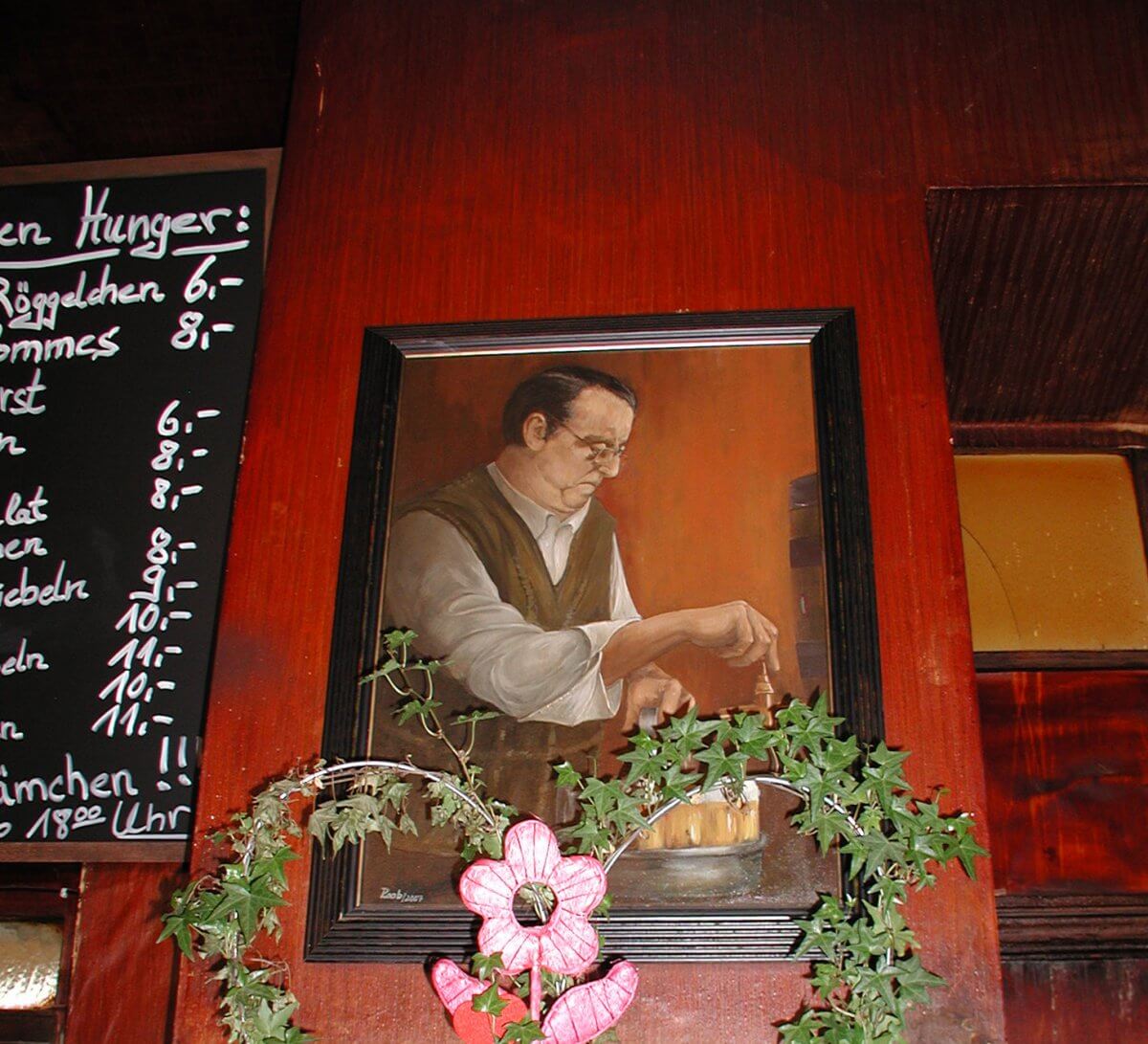 Im Früh, wo auch dieses Gemälde hängt, arbeiten sie schon seit 120 Jahren, ohne sie geht gar nichts, mit ihnen fast alles: Köbesse wie der Herr in blau rechts. Sie teilen dir das Bier zu (ich habe Glück, dass der für mich zuständige mir zum Wasser keine Seife serviert, wie das im Brauhaus manchmal passieren soll).