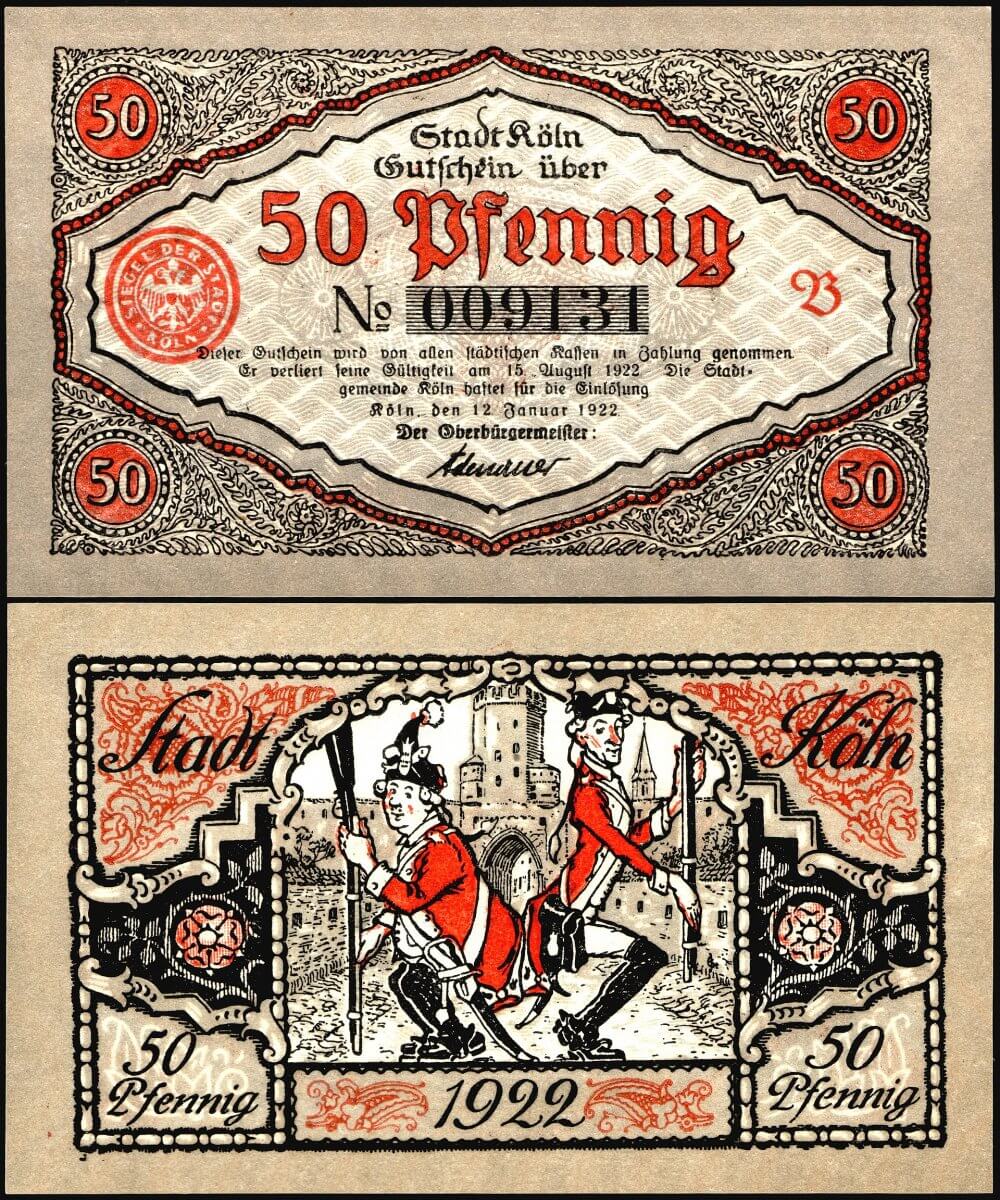 Dieser vom Oberbürgermeister Konrad Adenauer unterschriebene Notgeldschein von 1922 stellt zwei Mitglieder der Roten Funken beim Stippeföttche dar.